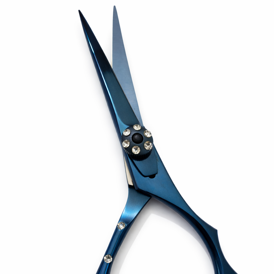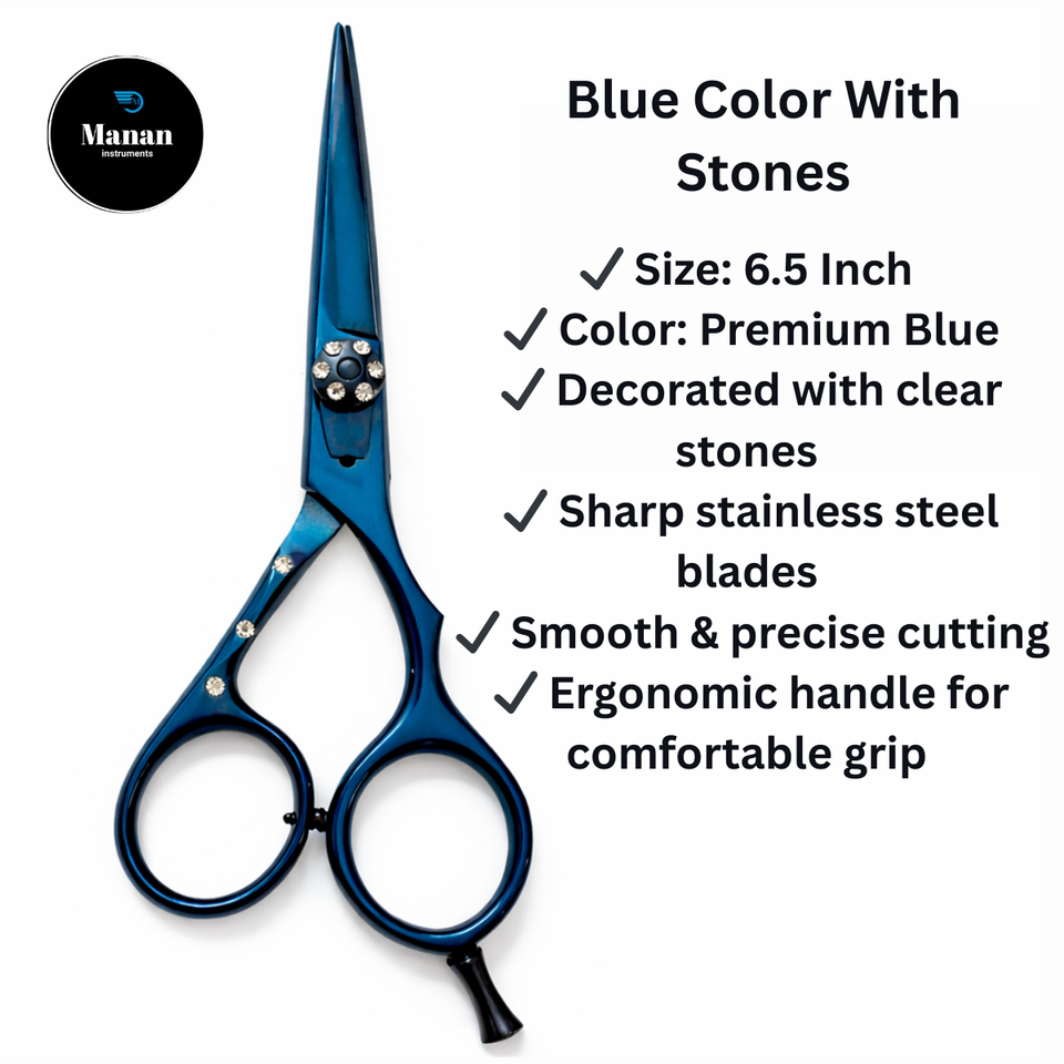 กรรไกรตัดผมมืออาชีพขนาด 6.5 นิ้ว ทำจากสแตนเลส ใบมีดคม สำหรับคนถนัดขวา ดีไซน์สีน้ำเงินตามหลักสรีรศาสตร์