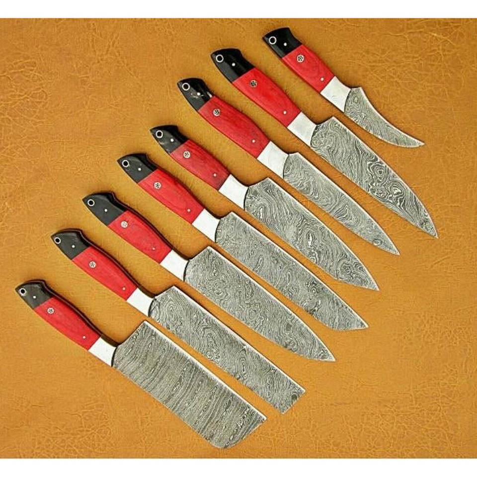 ชุดมีดเชฟเหล็กดามัสกัส8ชิ้นแบบมืออาชีพใบมีดปลอมเครื่องตัดพร้อมปลอกหนังสำหรับใช้ในครัว