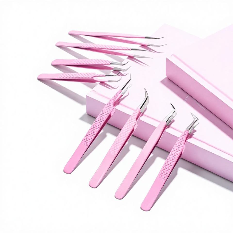 แหนบต่อขนตาสแตนเลสสตีลสีชมพู90องศาสำหรับมืออาชีพปลายต่อขนตาแบบเส้นใยแข็งเพื่อความงามอย่างยั่งยืนแหนบโลหะมีเสน่ห์