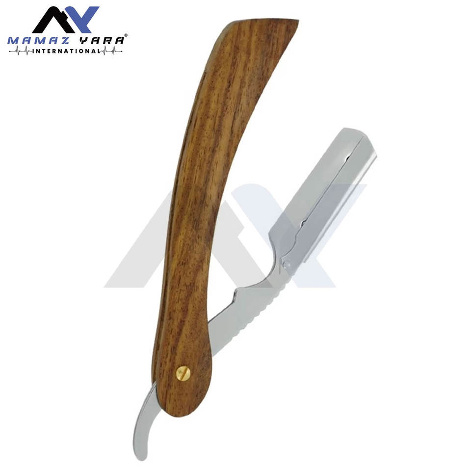 มีดโกนหนวดแบบพับได้สำหรับช่างตัดผมมืออาชีพ ใบมีดคมเดียว ด้ามไม้พร้อมตัวล็อคแบบสวิง อุปกรณ์โกนหนวดคุณภาพพรีเมียมสำหรับช่างตัดผม