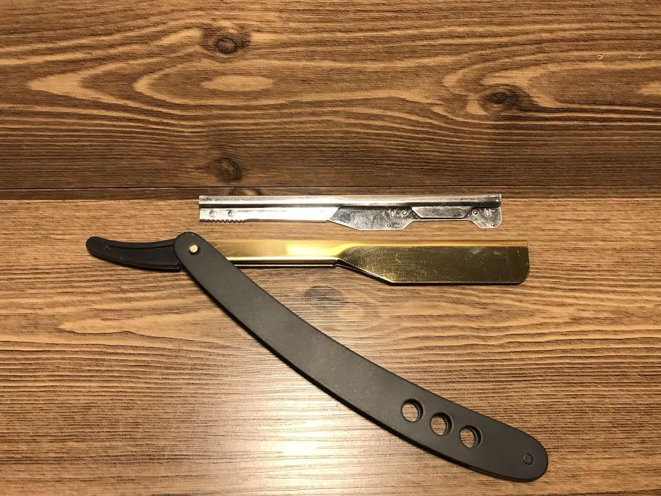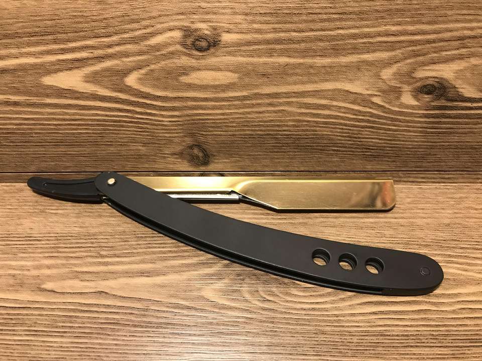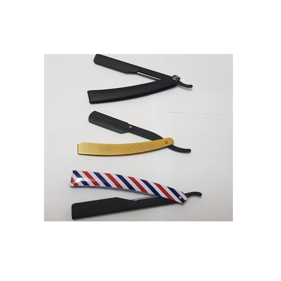 มีดโกนหนวดตรงสแตนเลสอย่างดีเคลือบโลโก้ร้านตัดผมมืออาชีพ พร้อมใบมีดแบบโชว์