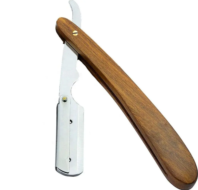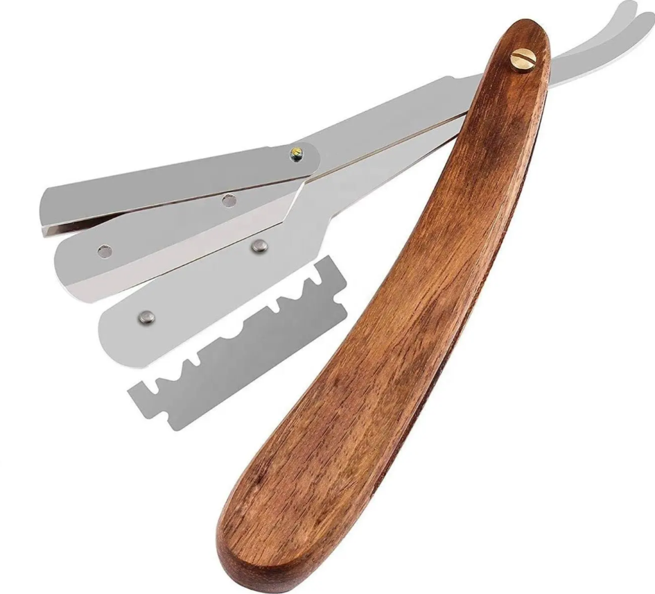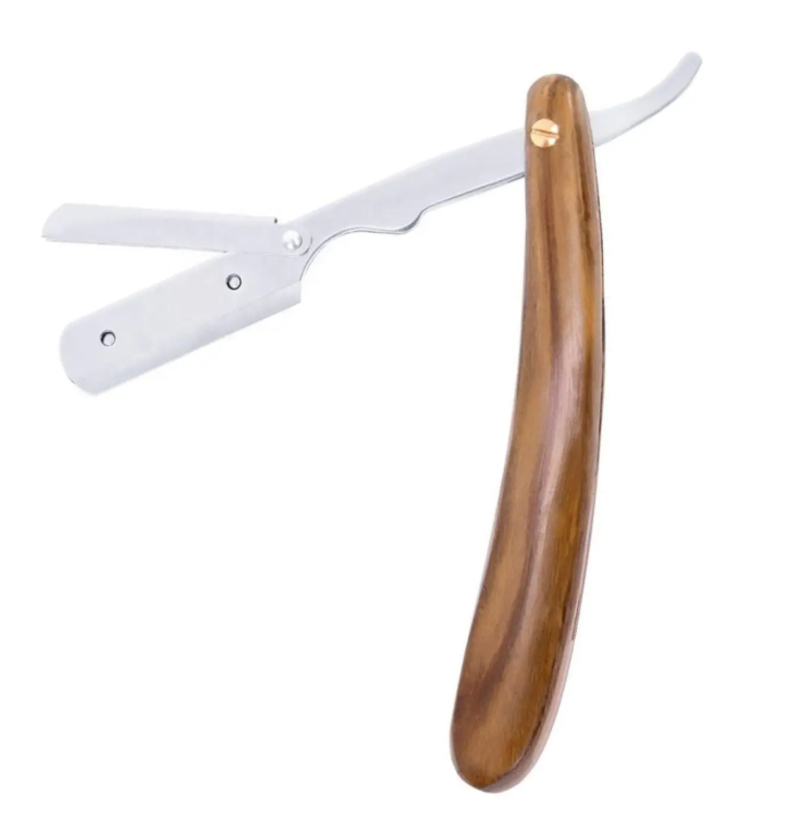มีดโกนสไตล์ช่างตัดผมมืออาชีพมีกระเป๋าสแตนเลสที่โกนหนวดแบบหมุนตรงด้ามจับไม้ธรรมชาติ