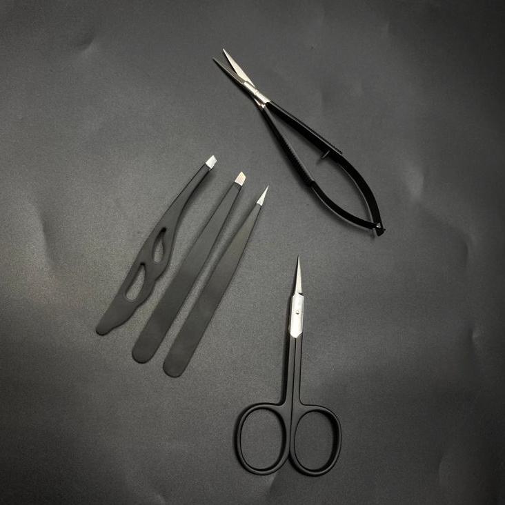 ชุดกรรไกรตัดคิ้วสแตนเลสแบบแข็งเคลือบสีดำสำหรับมืออาชีพชุดกรรไกรเล็มคิ้วเครื่องมือการสร้างความงาม