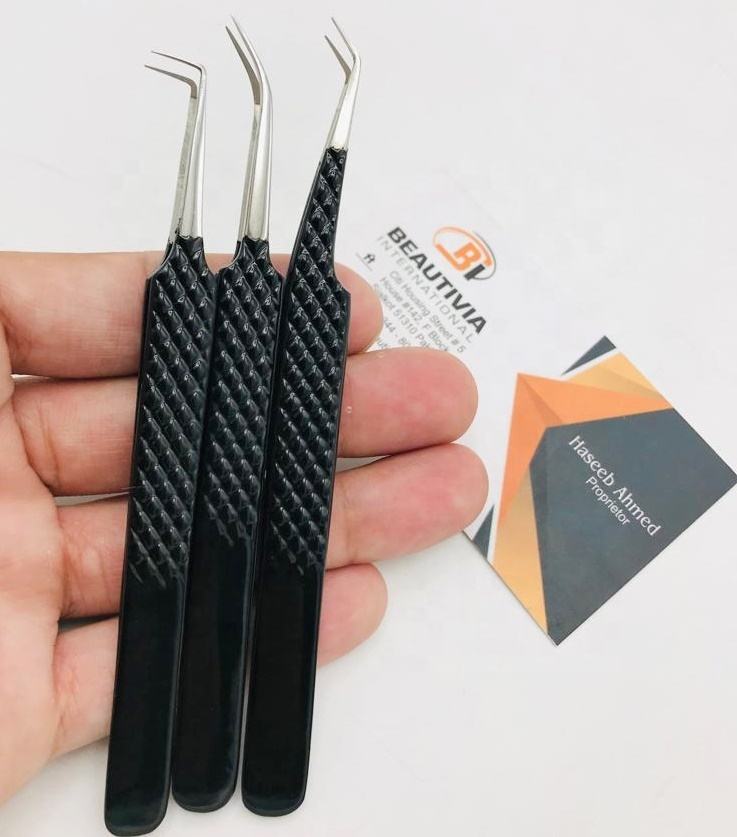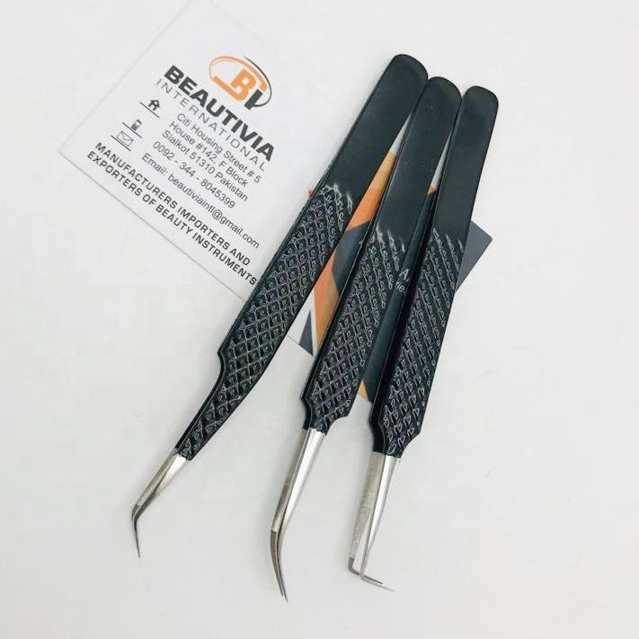 คีมคีบขนตาแบบเส้นใยเกรดสำหรับการผ่าตัดออกแบบโลโก้ได้อย่างมืออาชีพด้ามจับที่สมบูรณ์แบบทำจากสเตนเลสเคลือบสีดำทนทาน