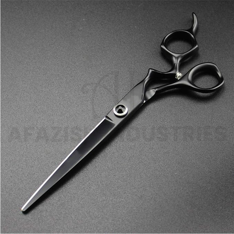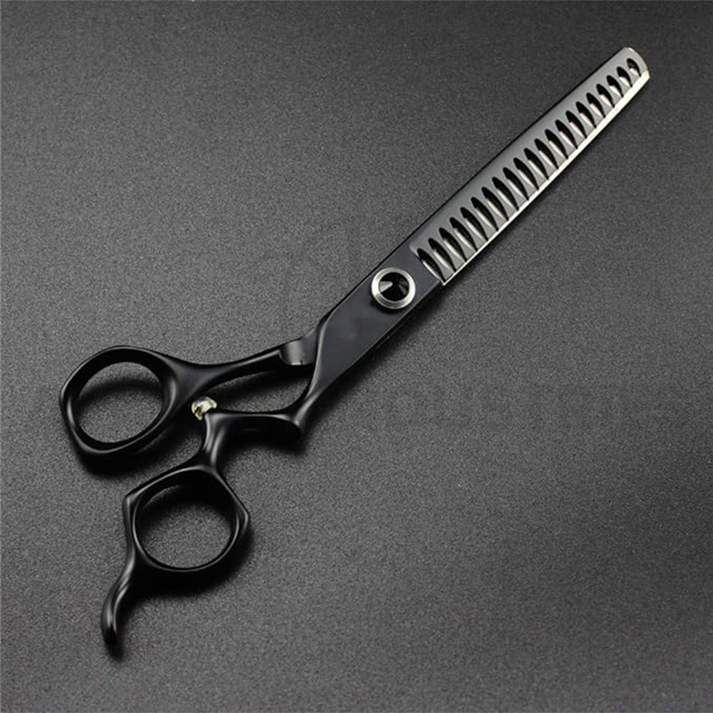 กรรไกรตัดขนสุนัขสแตนเลสเคลือบสีดำแบบมืออาชีพกรรไกรตัดผมโค้งบางตรงเพื่อการดูแลความงาม