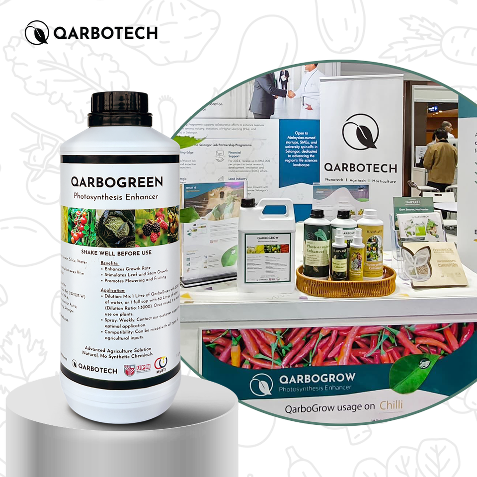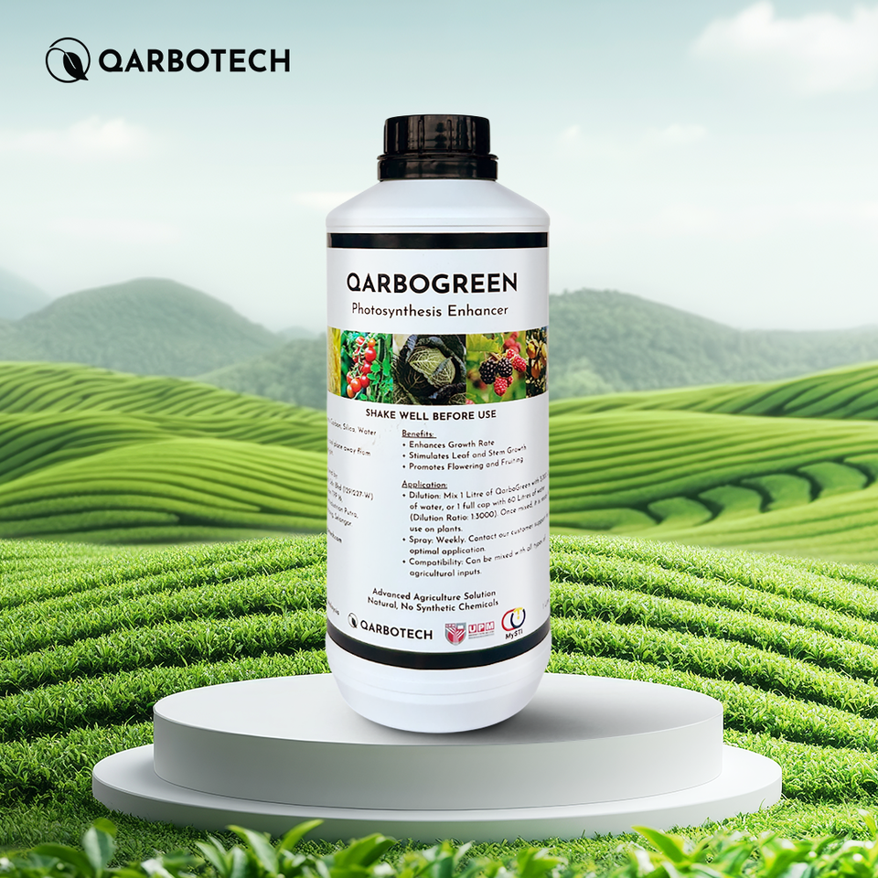 สารเพิ่มประสิทธิภาพการสังเคราะห์แสงสำหรับการเกษตรแบบน้ำบริสุทธิ์ 99% ยี่ห้อ QarboGreen สำหรับการใช้งานในพื้นที่ขนาดใหญ่ ผลิตในประเทศมาเลเซีย