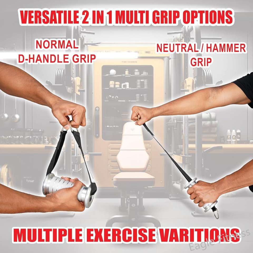 ด้ามจับทรงกรวยแบบมืออาชีพพร้อมเชือกและคาราไบเนอร์สำหรับระบบรอก - ดีไซน์กันลื่นแบบมีลายกันลื่นสำหรับการดึงข้อศอกลง (Lat Pulldown) และการบริหารกล้ามเนื้อหลังส่วนล่าง (Curls) และการบริหารกล้ามเนื้อหลังส่วนบน (Flyes)