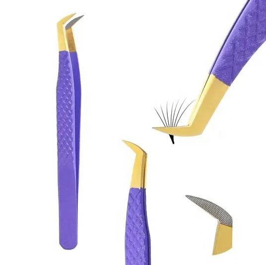 แหนบปลายไฟเบอร์สีทองม่วงสแตนเลสสตีลแบบมืออาชีพสำหรับต่อขนตาแบบแยกเส้นและเพิ่มวอลลุ่ม
