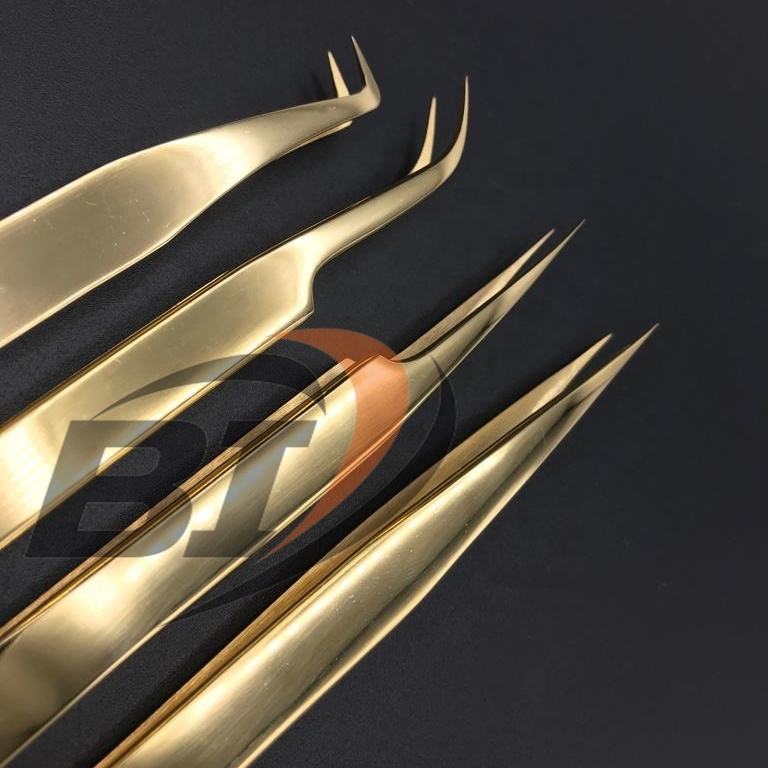 แหนบปลายแหลมสำหรับต่อขนตาพลาสม่าสีทองติดฉลากได้ตามต้องการแบบมืออาชีพ