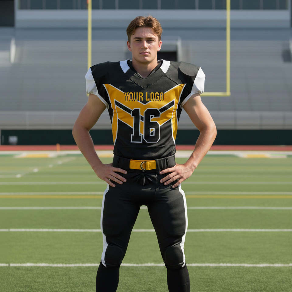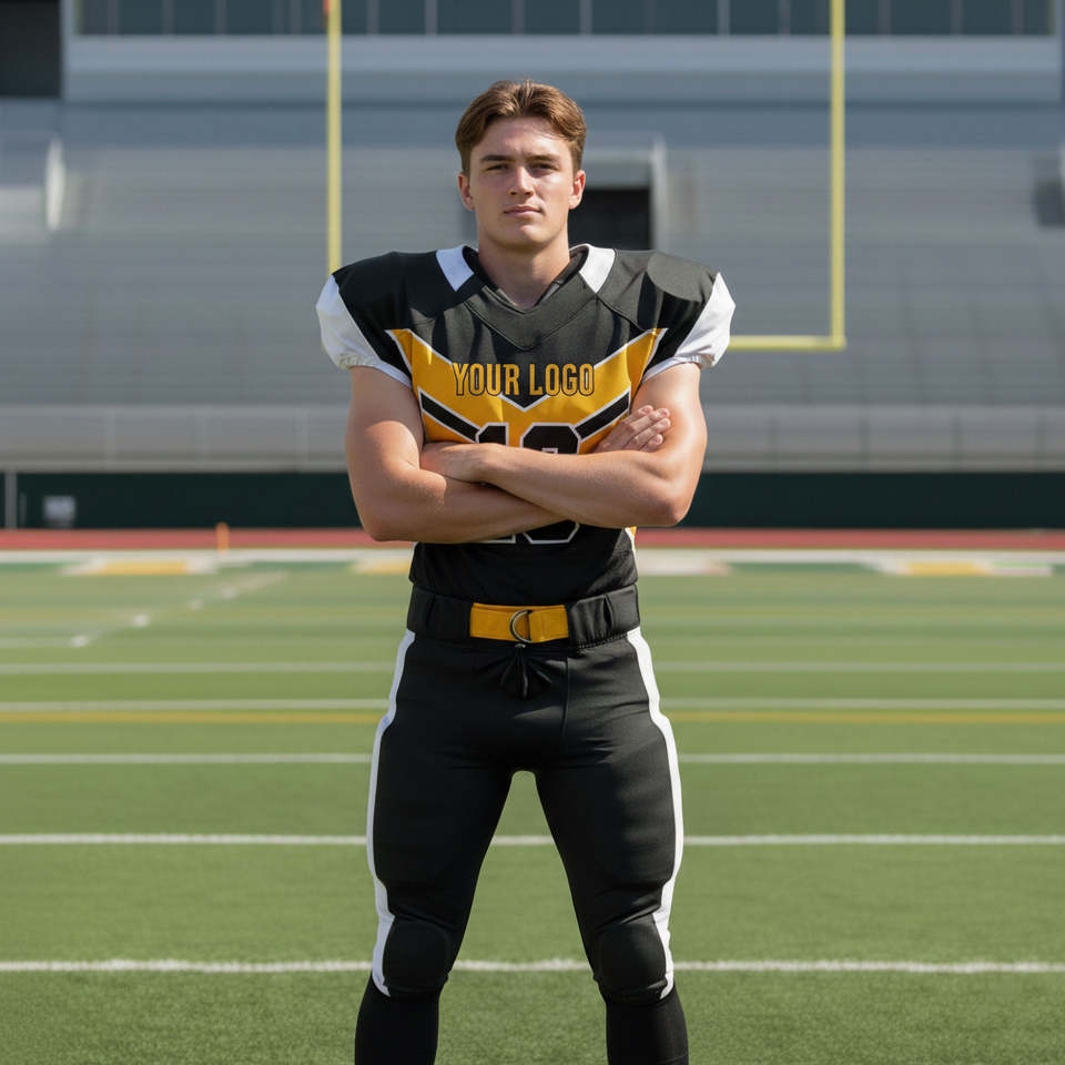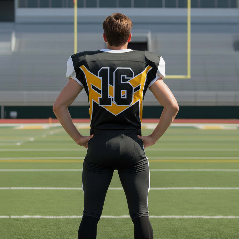 ชุดยูนิฟอร์มอเมริกันฟุตบอลแบบมืออาชีพ ออกแบบเองได้ พร้อมชื่อทีมและหมายเลข สำหรับผู้ชายและเยาวชน ดีไซน์แบบซับลิเมชั่น
