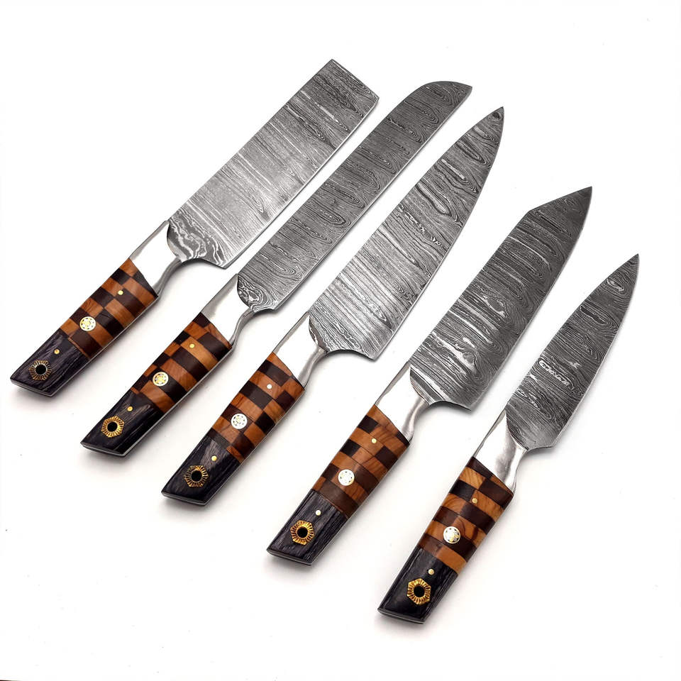 ชุดมีดทำครัวเหล็กดามัสกัสแบบมืออาชีพชุดมีดด้ามไม้5ชิ้น