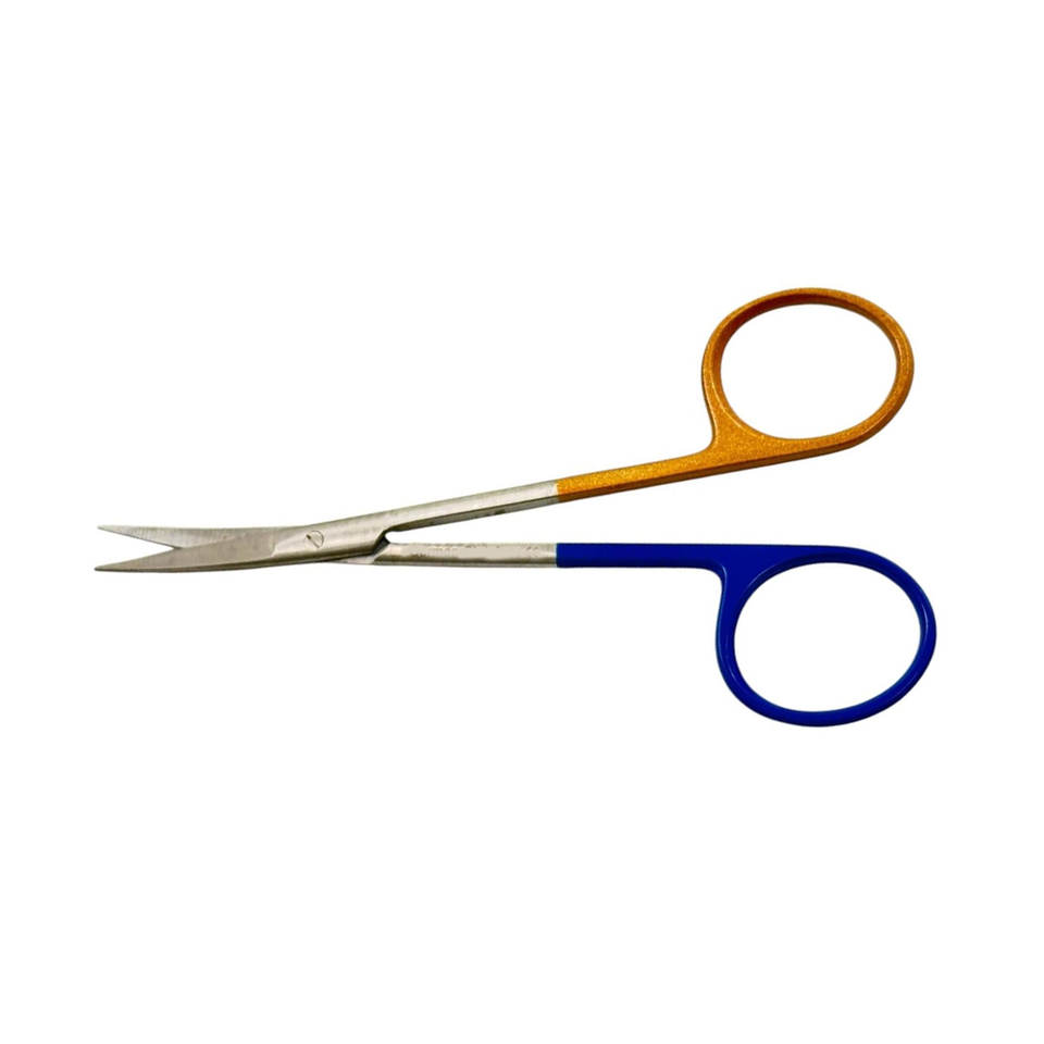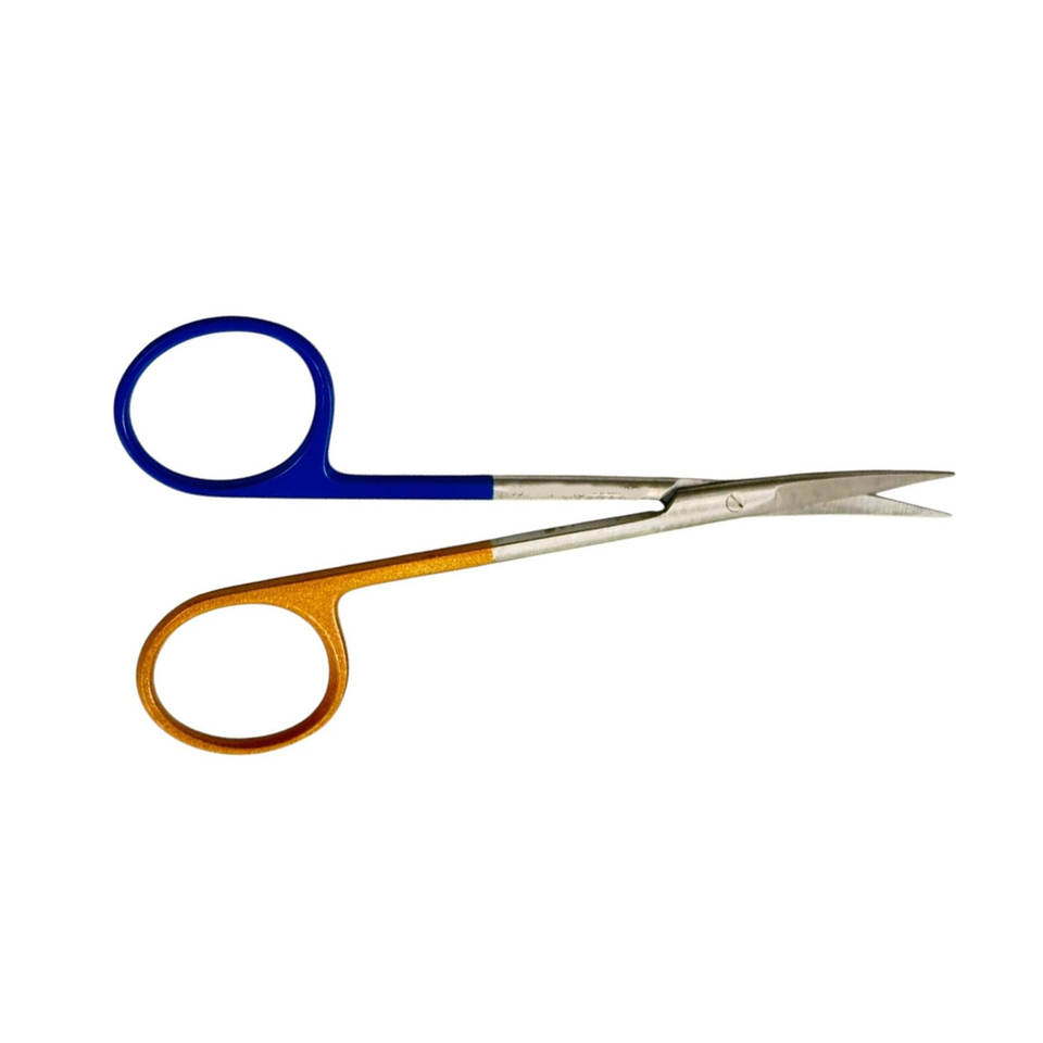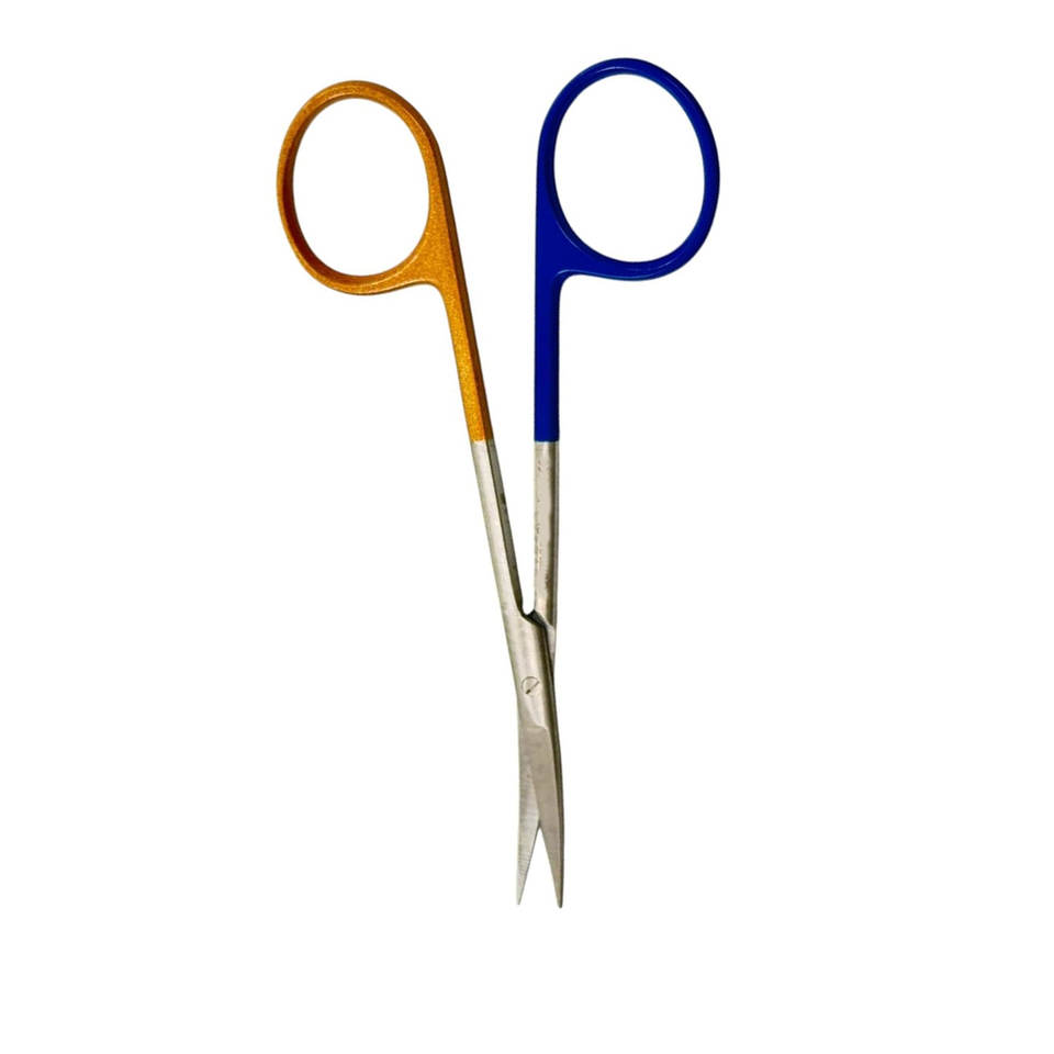 กรรไกรผ่าตัดแบบมืออาชีพ ใบมีดโค้งและตรง ปลายคมแม่นยำ ด้ามจับสีทองและสีน้ำเงิน ผลิตในเยอรมนี