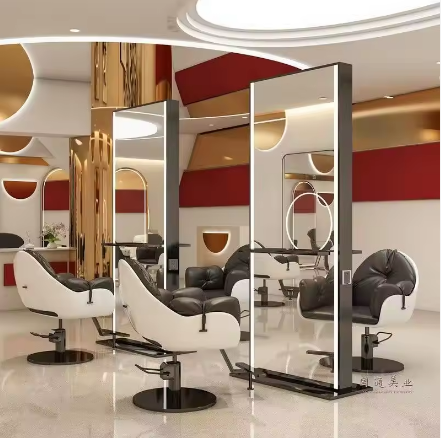 กระจกตัดผมสองด้านแบบมืออาชีพสำหรับร้านเสริมสวย โครงโลหะพร้อมไฟ LED กระจกตั้งพื้นสำหรับร้านเสริมสวย