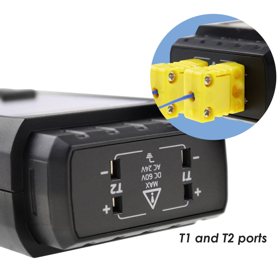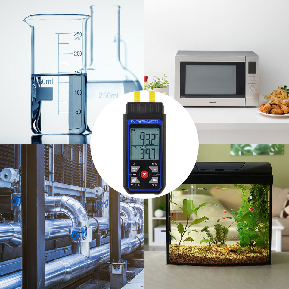 เครื่องวัดอุณหภูมิเทอร์โมคัปเปิลแบบสองช่องสัญญาณระดับมืออาชีพ - เครื่องวัดอุณหภูมิชนิด K/J ความแม่นยำสูง พร้อมไฟพื้นหลังสีและสัญญาณเตือน