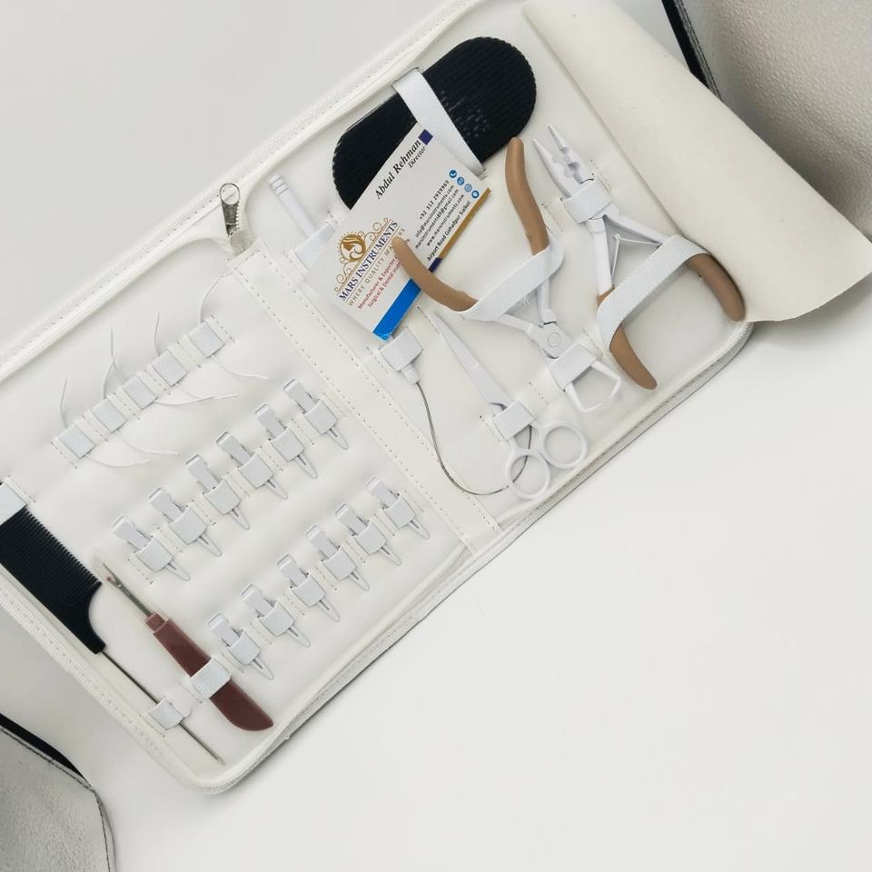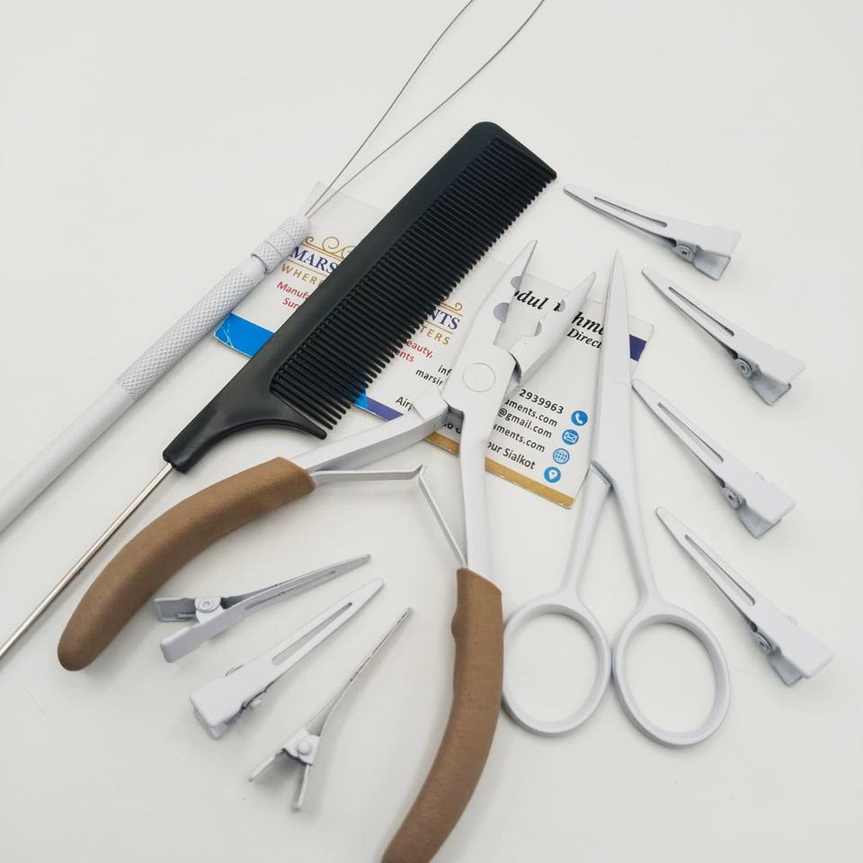 ชุดเครื่องมือต่อผมสแตนเลสสีขาวคุณภาพระดับมืออาชีพ ทนทาน พร้อมคีม 2 รู กรรไกร คลิป หวี และห่วง