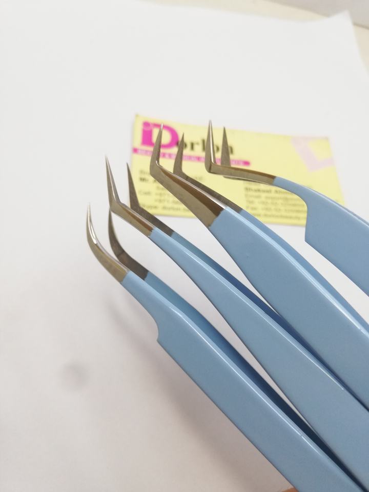 แหนบปลายขนตาแบบมืออาชีพแหนบต่อขนตาเคลือบสีฟ้าน้ำแข็งสแตนเลส