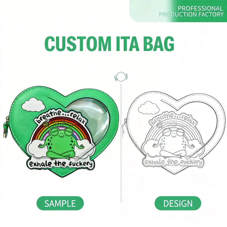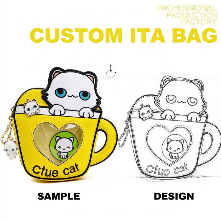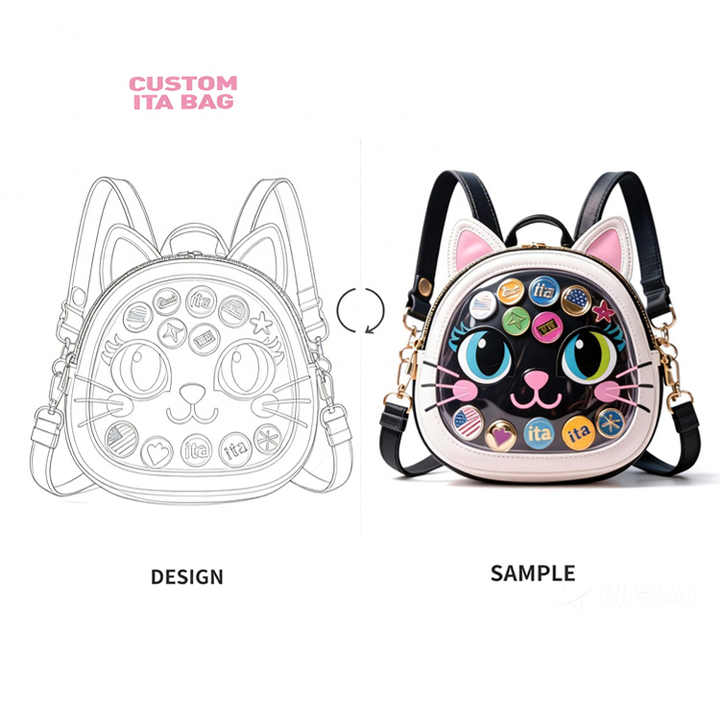 โรงงานผลิตกระเป๋า Ita Bag แบบกำหนดเอง รูปทรงหัวแมว 3 มิติ ช่องใส สะพายข้าง รับผลิตแบบ OEM ODM สำหรับนักสะสมเข็มกลัด