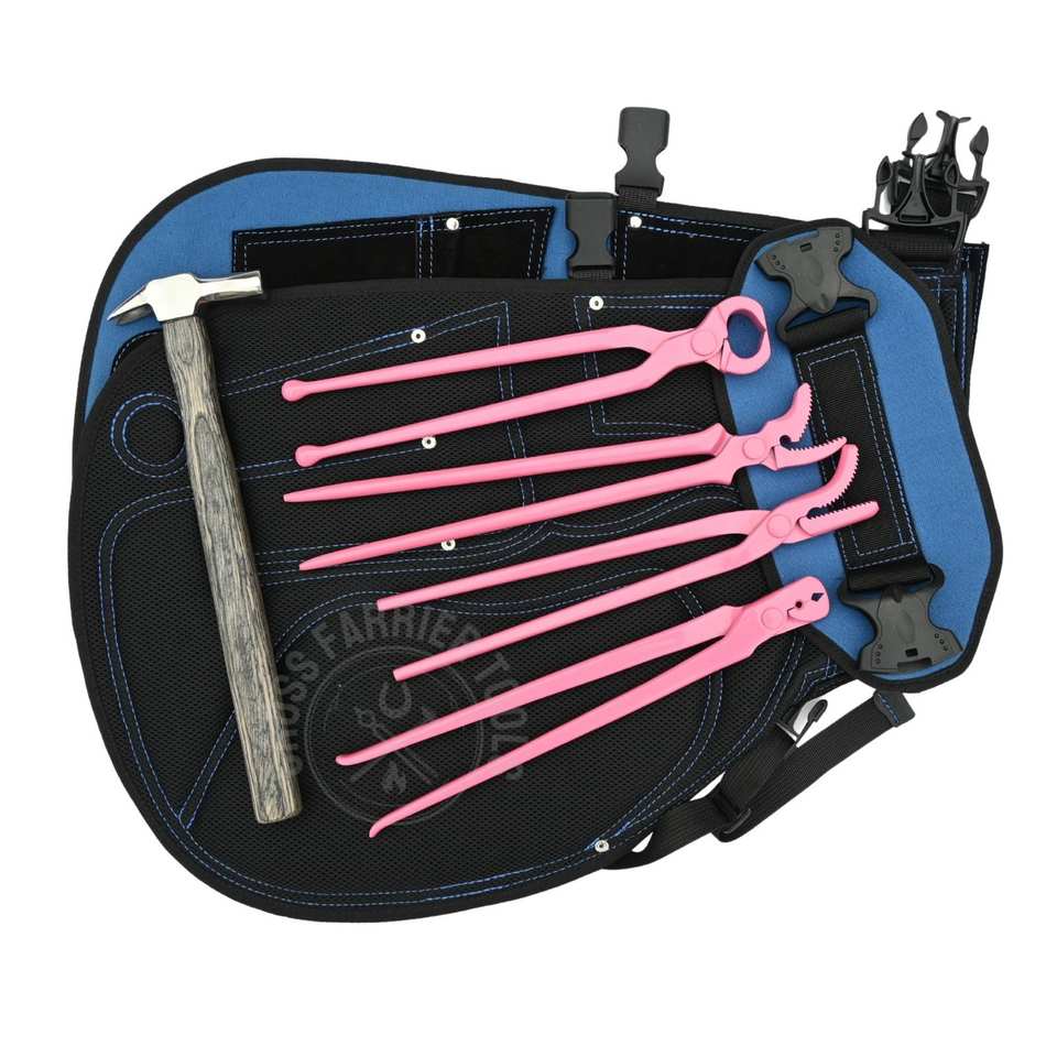 ผ้ากันเปื้อนช่างเกือกม้ามืออาชีพพร้อมชุดเครื่องมือ ค้อนตอกตะปูสีชมพู ที่ดึงตะปูรองเท้า ที่ดึงตะปูแบบจระเข้ และที่ดึงตะปูแบบโค้ง