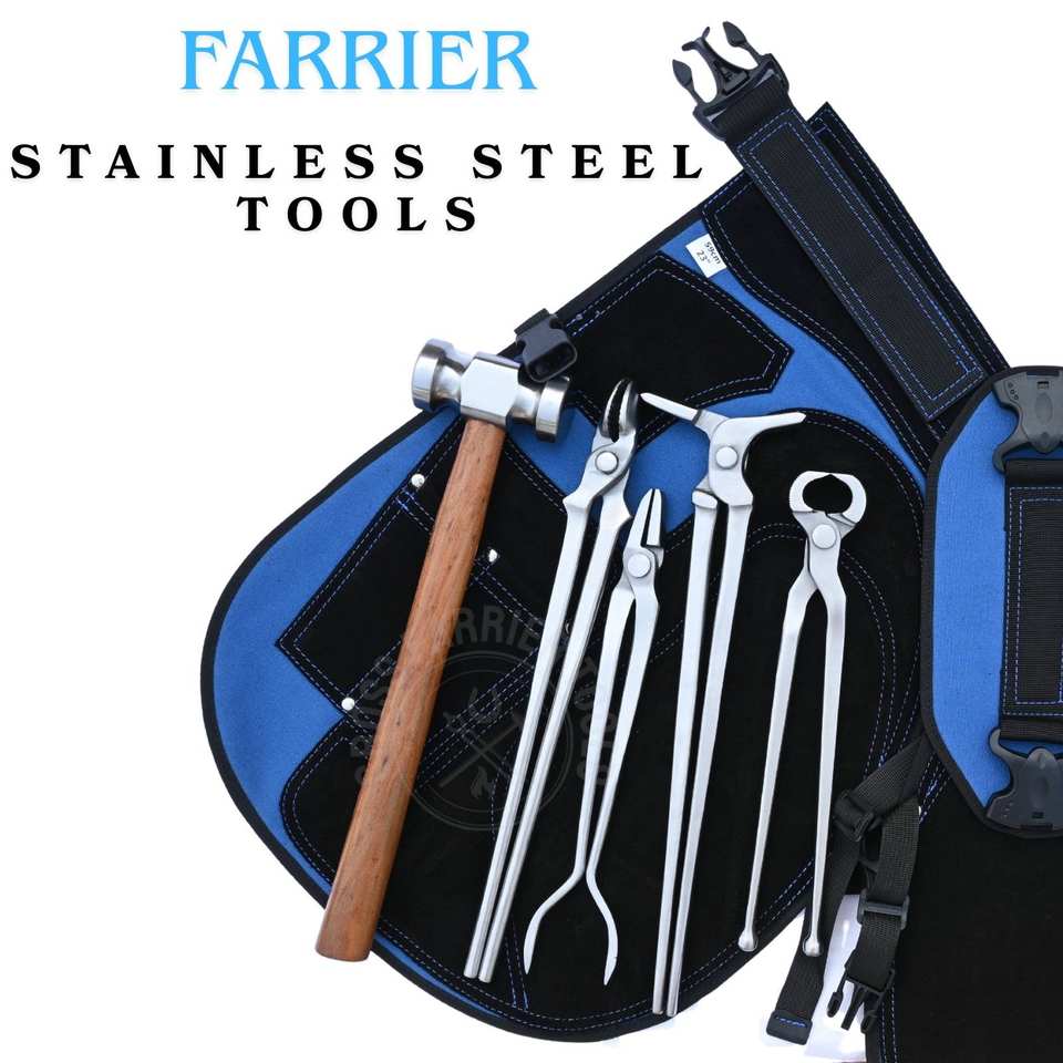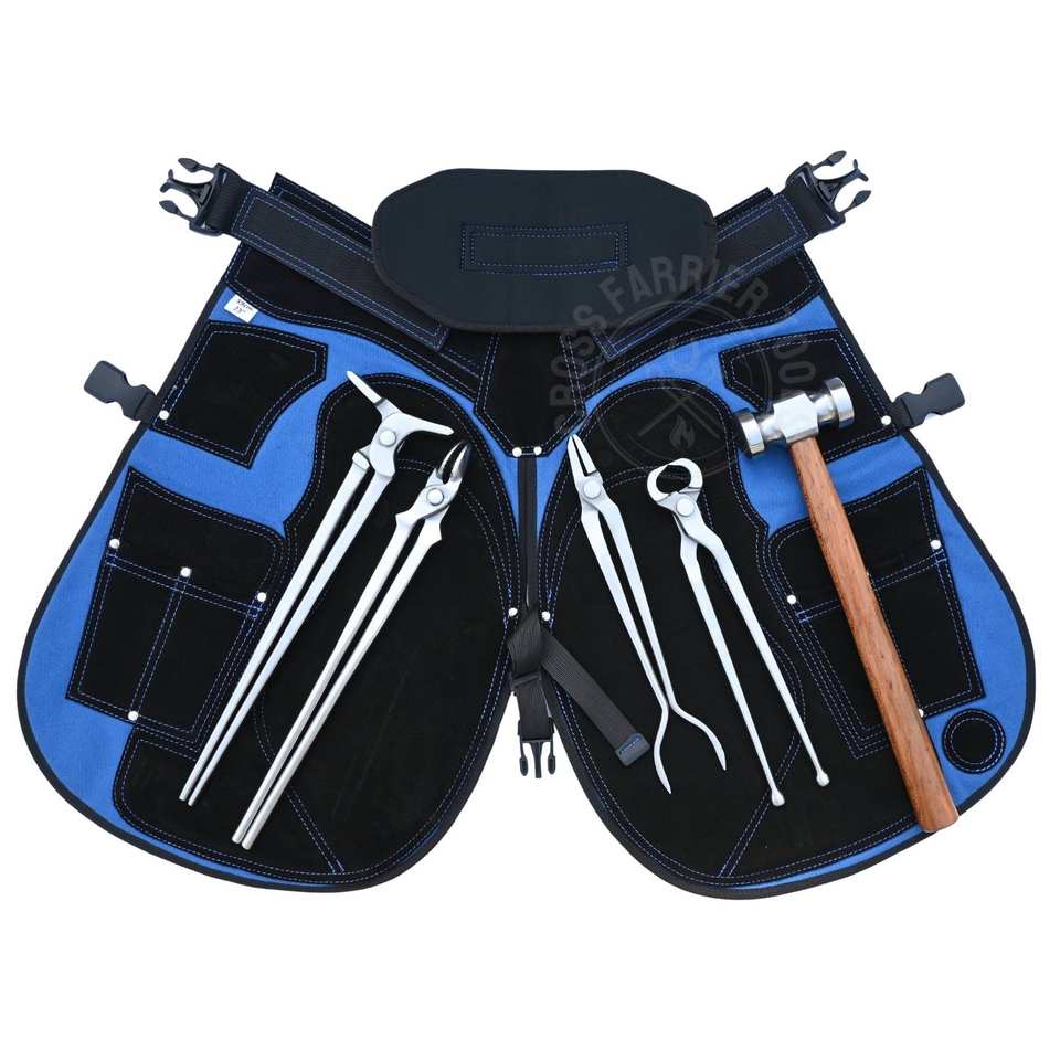 ชุดเครื่องมือช่างตีเกือกม้ามืออาชีพ ค้อนหนัก คีมจับเหล็ก คีมตัดหนังวัว คีมตัดหนังวัวแบบหัวกลม ที่ถ่างหนังวัว และผ้ากันเปื้อนช่างตีเกือกม้า