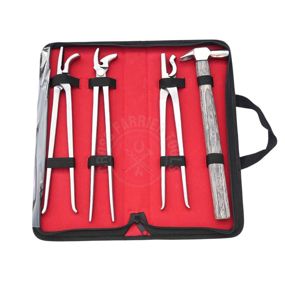 ชุดเครื่องมือช่างเกือกม้ามืออาชีพ ประกอบด้วยเครื่องมือตอกตะปูแบบอัลลิเกเตอร์ เครื่องมือตอกตะปูแบบโค้ง เครื่องมือตอกตะปูแบบมาตรฐาน และค้อนตอกกีบม้า