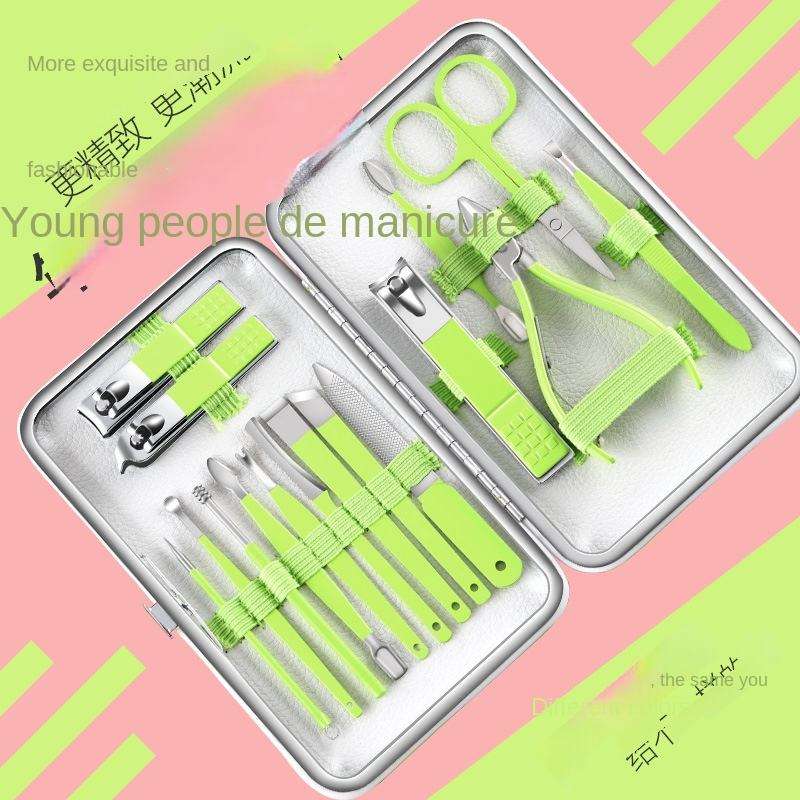 ชุดทำเล็บ16ชิ้นสีเขียวเรืองแสงแบบมืออาชีพทำจากสแตนเลสกรรไกรเสริมสวยกล่องโลโก้ออกแบบได้ตามต้องการ