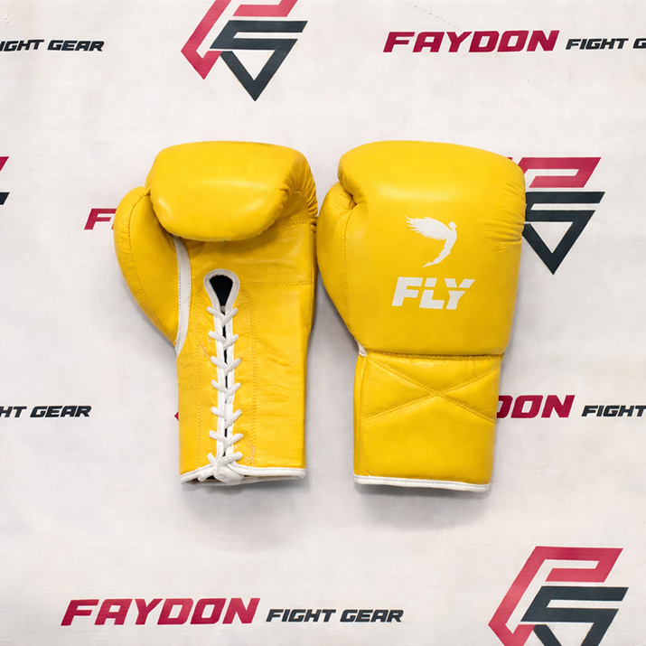 นวมชกมวยสีเหลืองสำหรับมืออาชีพ หนังแท้ สำหรับฝึกซ้อมและแข่งขัน น้ำหนักเบา ระบายความชื้นได้ดี มีแถบตีนตุ๊กแก