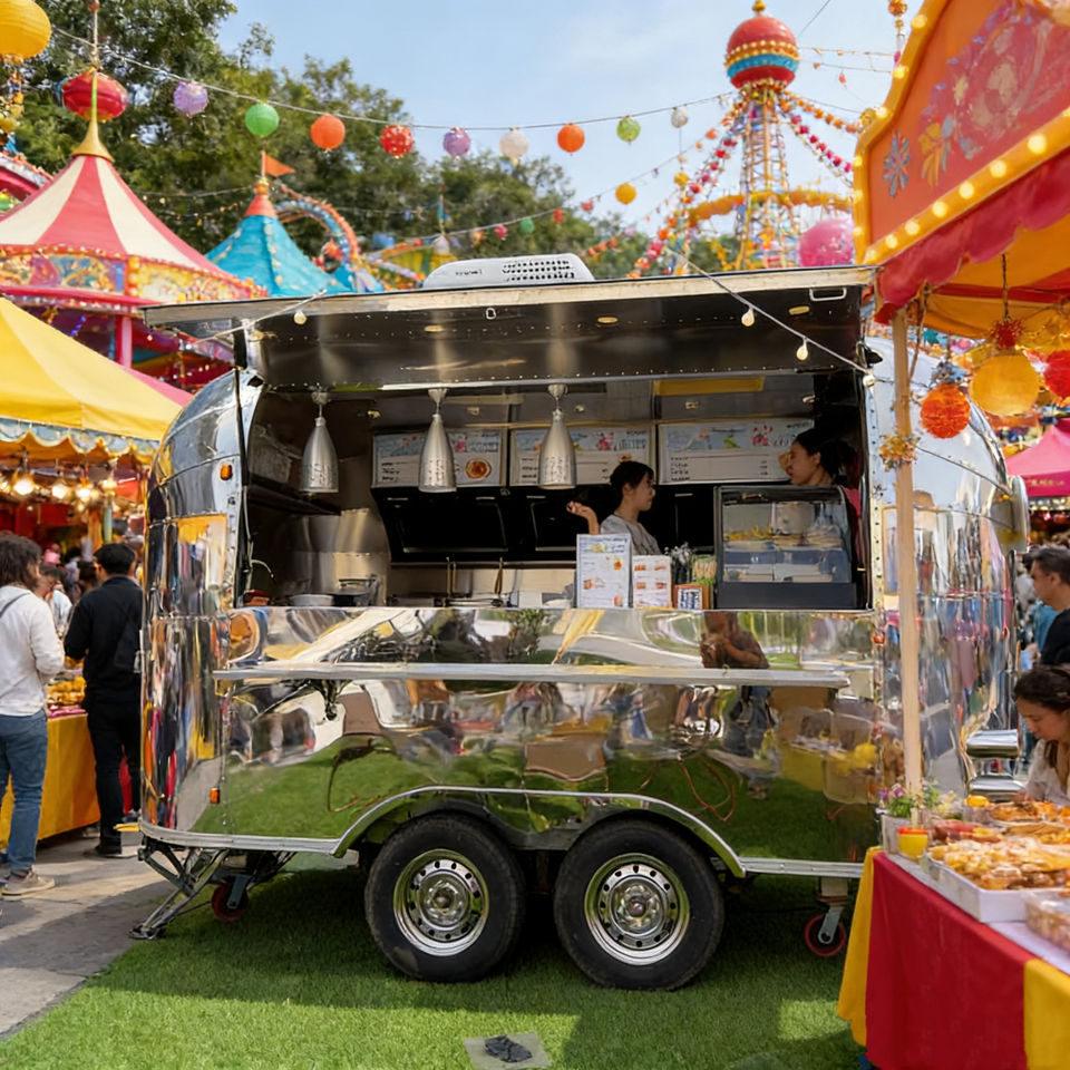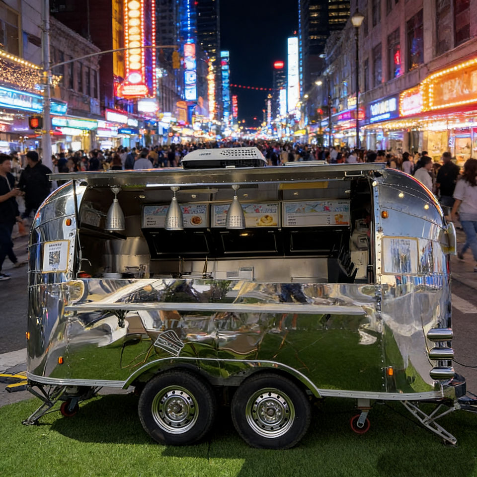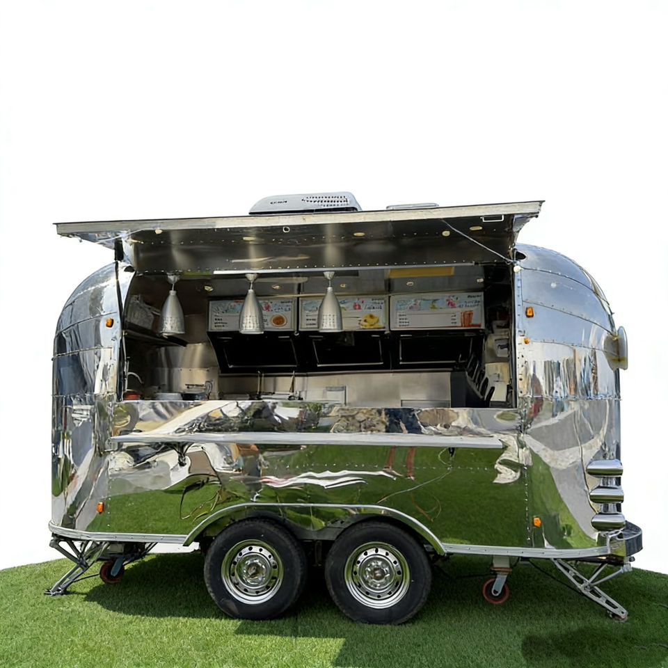 รถพ่วงจัดเลี้ยงเกรดมืออาชีพ ผิวเงาแบบกระจก พร้อมอุปกรณ์ครัวในตัว เหมาะสำหรับขายอาหารริมทางสไตล์ร้านอาหาร