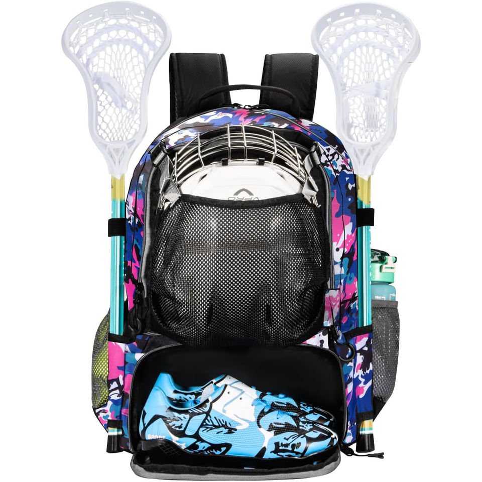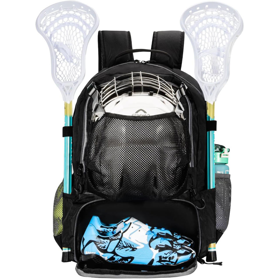 กระเป๋าเป้สะพายหลังสำหรับลาครอสแบบมืออาชีพ ทำจากโพลีเอสเตอร์ ดีไซน์แบบมีซิปและแผง จัดเก็บรองเท้าได้ด้านล่าง สายรัดด้านข้างสำหรับอุปกรณ์ครบชุด