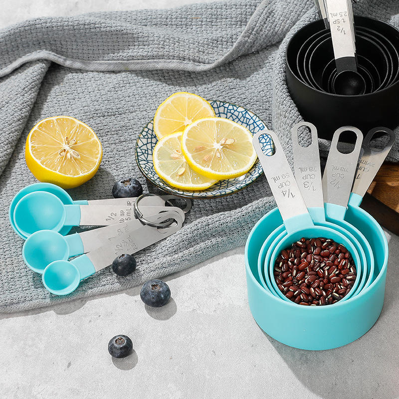 ชุดถ้วยตวงและช้อนตวงสีเทาแบบมืออาชีพพร้อมด้ามจับสแตนเลสเพื่อการอบและการปรุงอาหารที่แม่นยำ