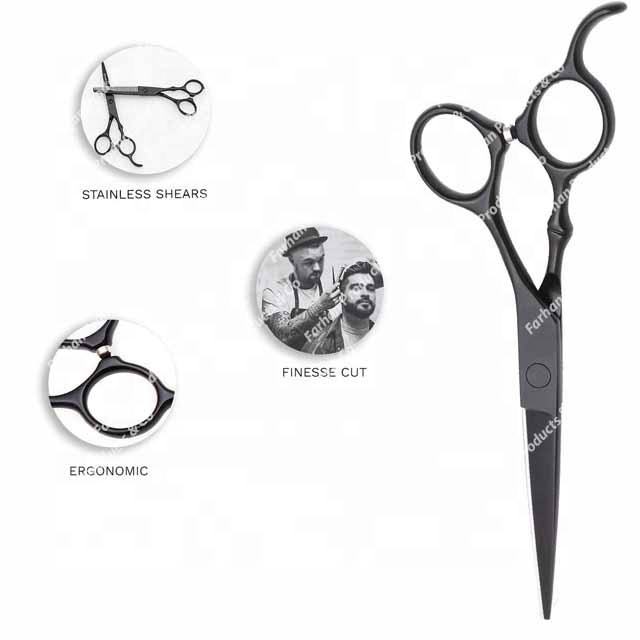 กรรไกรตัดผมแบบมืออาชีพสำหรับร้านเสริมสวยสีดำปรับระดับได้ใบมีดสแตนเลสปรับแต่งโลโก้พลาสติก