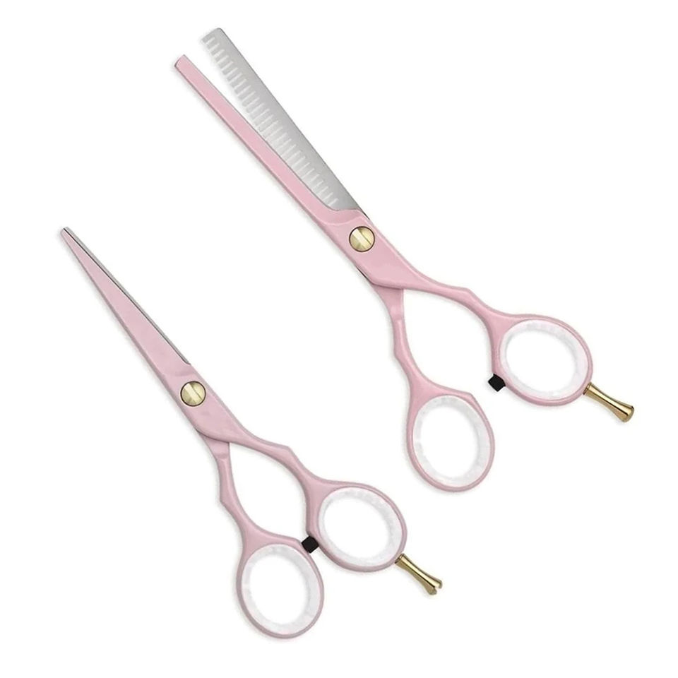 ชุดกรรไกรตัดผมมืออาชีพ สีชมพู พร้อมกรรไกรซอยผมแบบปรับได้สีทอง และที่พักนิ้วมือ อุปกรณ์ทำผม