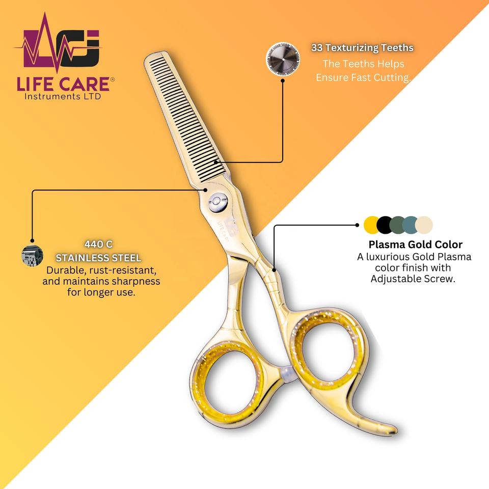 ชุดกรรไกรตัดผมแบบมืออาชีพสีทองกรรไกรตัดผมบางปรับสกรูได้อุปกรณ์ดูแลชีวิตสแตนเลสสตีล