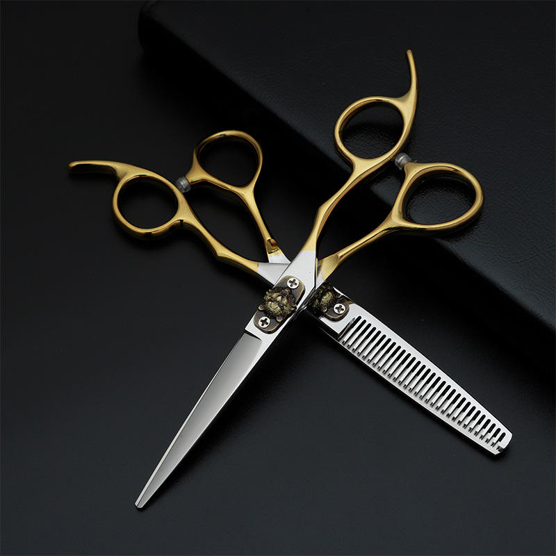 กรรไกรตัดผมมืออาชีพสแตนเลสสตีลใบมีดคมด้ามยาวครึ่งสีทองสำหรับใช้ในร้านเสริมสวย 210 กรัม