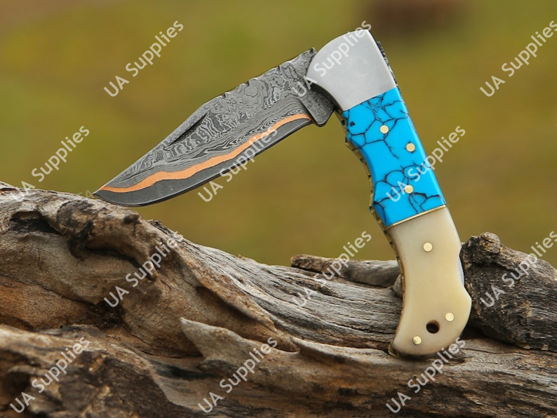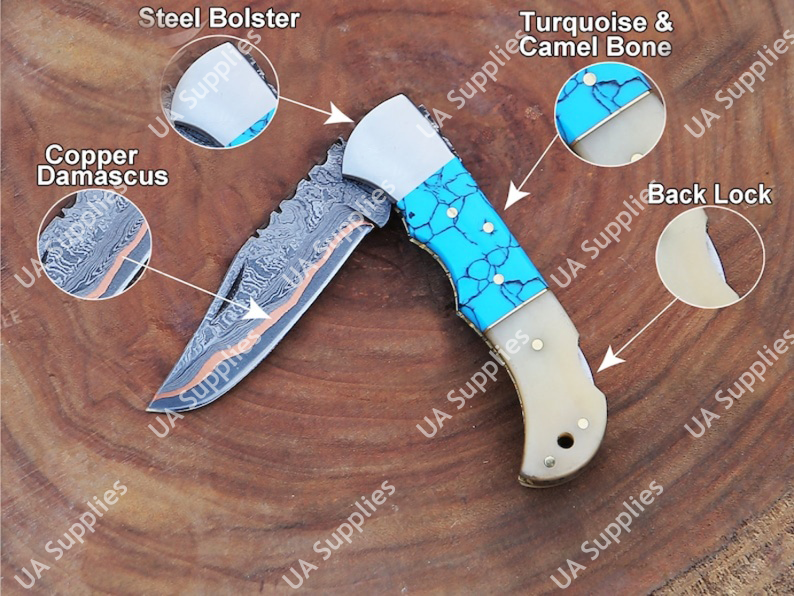 Hand Forged Copper Damascus Folding Pocket EDC Knife