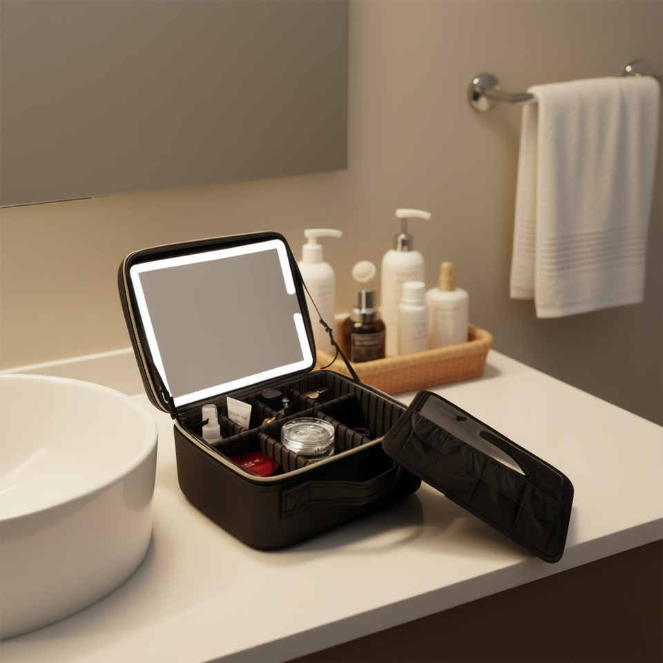 กระเป๋าใส่เครื่องสำอางแบบพกพาความจุสูงสำหรับมืออาชีพ พร้อมกระจกมีไฟ ปิดด้วยซิป ทันสมัย สีดำ