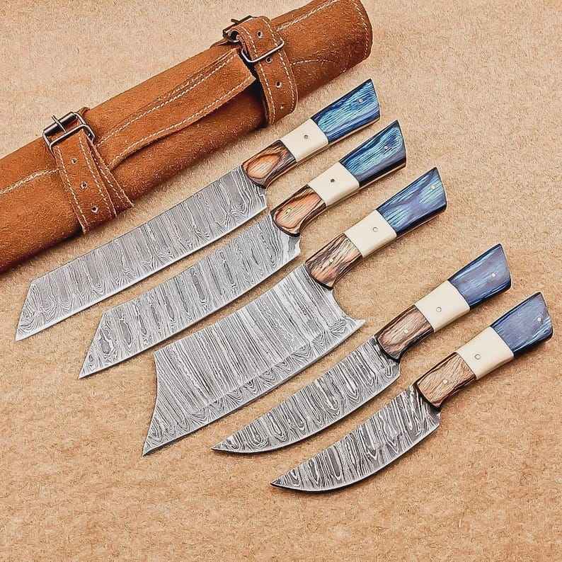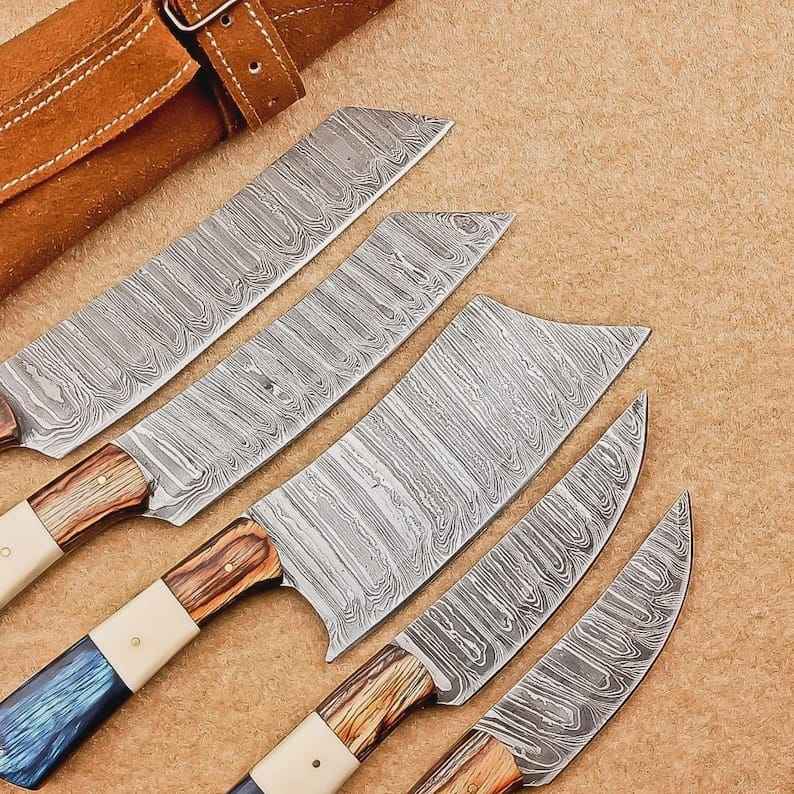 ชุดมีดเชฟเหล็กดามัสกัสคุณภาพสูงระดับมืออาชีพ 5 ชิ้น ด้ามไม้ทำมือ ขายดีจากโรงงานโดยตรง