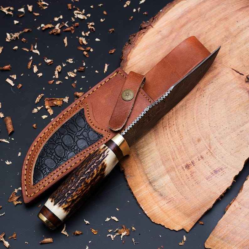มีดล่าสัตว์ทำมือคุณภาพสูงระดับมืออาชีพจากเหล็กดามัสกัส ด้ามทำจากเขากวางและไม้ สำหรับการตั้งแคมป์เอาตัวรอดกลางแจ้ง