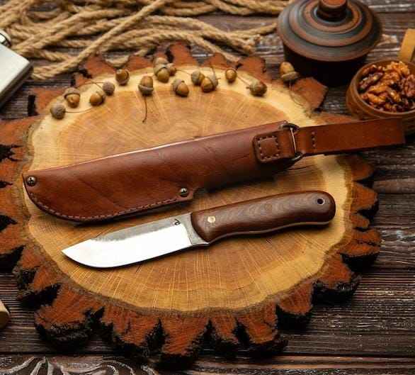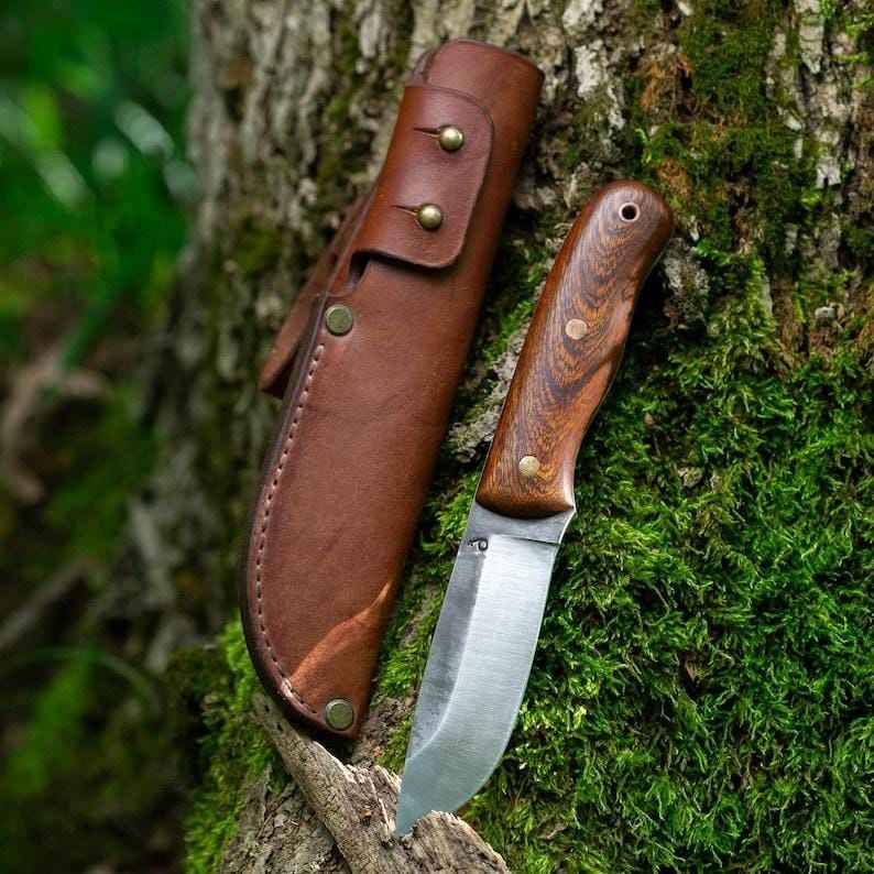 มีดล่าสัตว์และตั้งแคมป์คุณภาพสูงระดับมืออาชีพ ผลิตจากเหล็กกล้าคาร์บอนสูง พร้อมโลโก้สั่งทำพิเศษ ด้ามไม้ทำมือ พร้อมปลอกหนัง