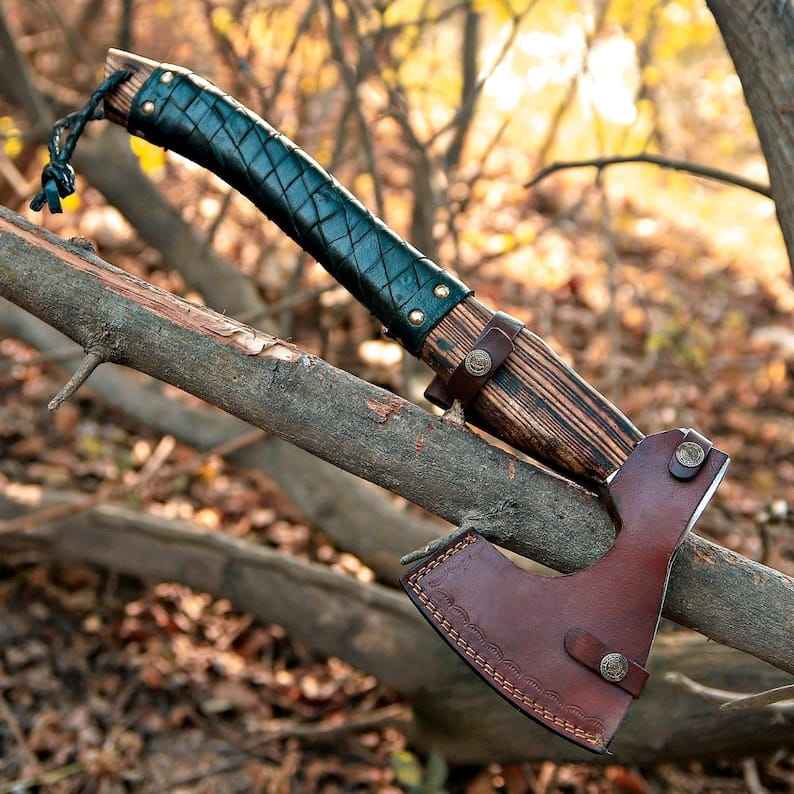 ขวานไวกิ้งคุณภาพสูงระดับมืออาชีพ ตีขึ้นรูปด้วยมือ ด้ามไม้ เหล็กกล้าคาร์บอนสูง พร้อมปลอกหนังอย่างดีสำหรับกิจกรรมกลางแจ้ง