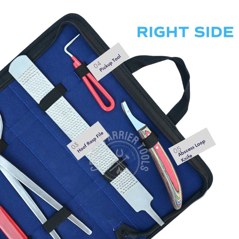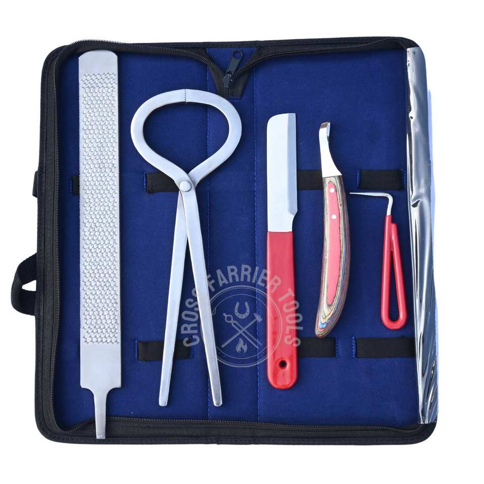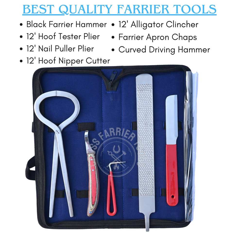 ชุดเครื่องมือช่างเกือกม้ามืออาชีพสำหรับดูแลกีบม้า ประกอบด้วยตะไบแต่งกีบม้า เครื่องมือทดสอบกีบม้า มีดตัดกีบม้า มีดตัดหนังรอบกีบม้า และอุปกรณ์เก็บกีบม้า