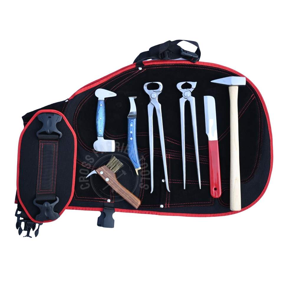 ชุดอุปกรณ์ตัดแต่งกีบม้าแบบมืออาชีพ พร้อมอุปกรณ์ขัดแต่งกีบ ที่ตอกตะปู ผ้ากันเปื้อนนิรภัย มีดตัดกีบ คีมถอดกีบ และที่ตัดกีบม้า