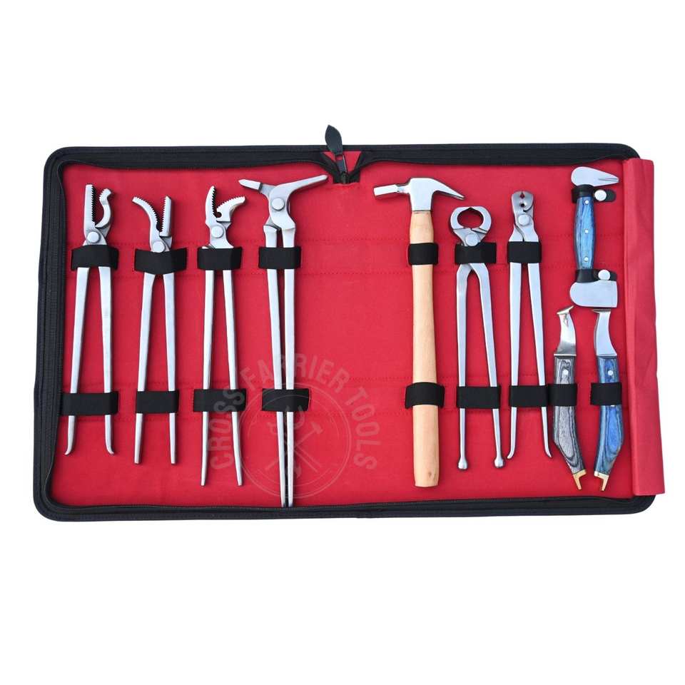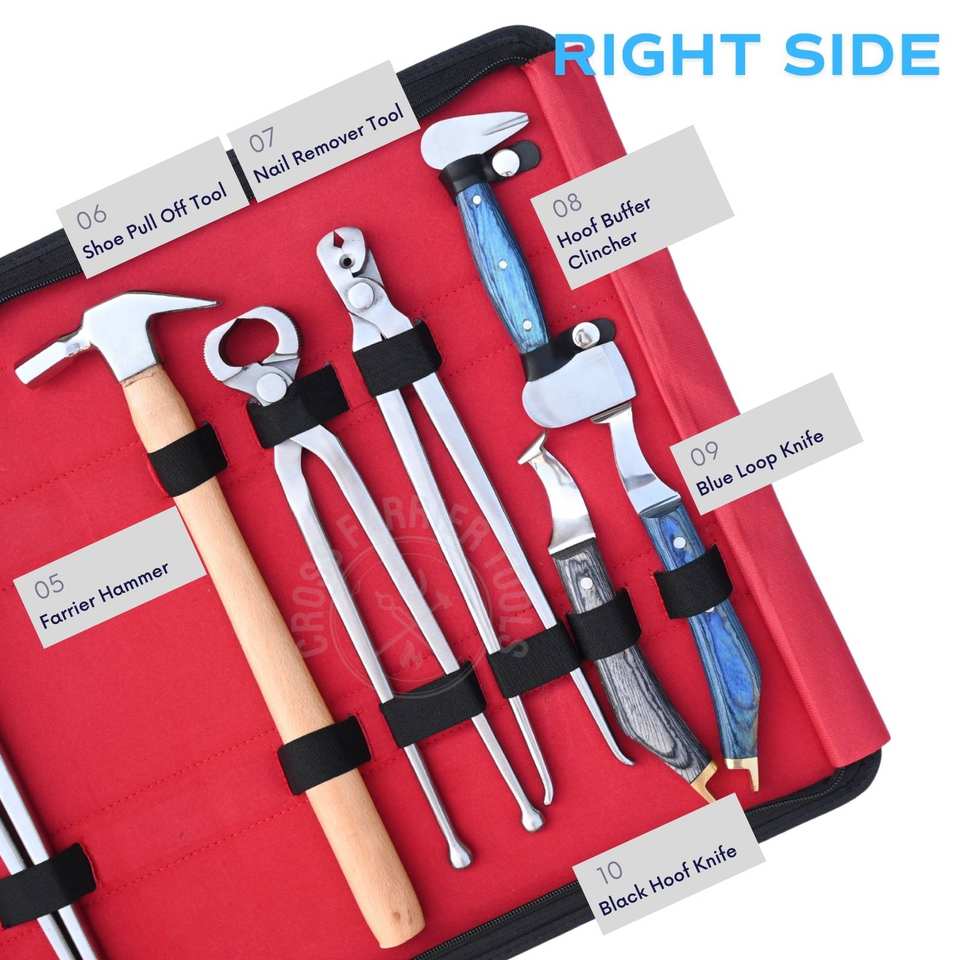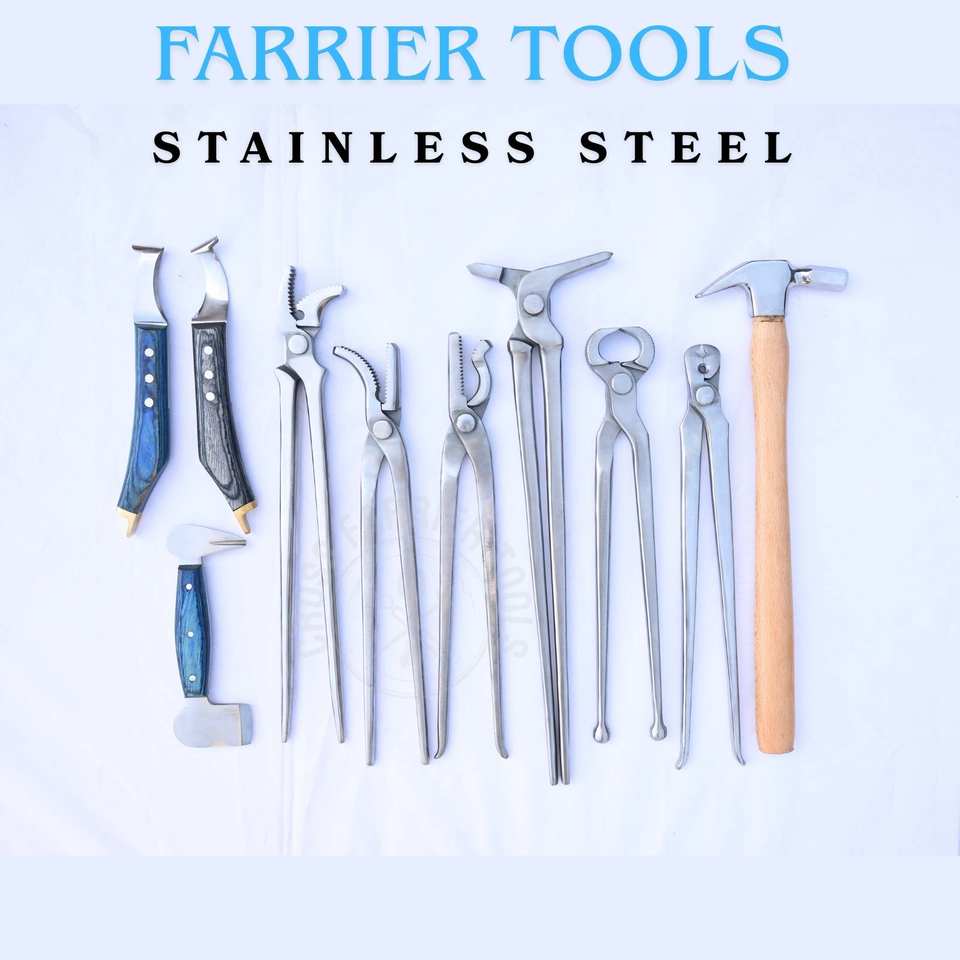 ชุดเครื่องมือช่างเกือกม้ามืออาชีพ ประกอบด้วย ที่ถ่างกีบม้า ค้อนตอกตะปู ที่ถอนตะปู ที่หนีบตะปู และเครื่องมือถอดกีบม้า