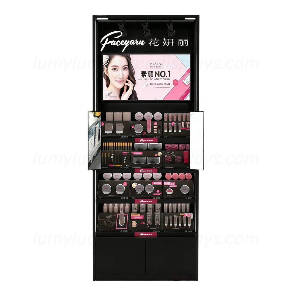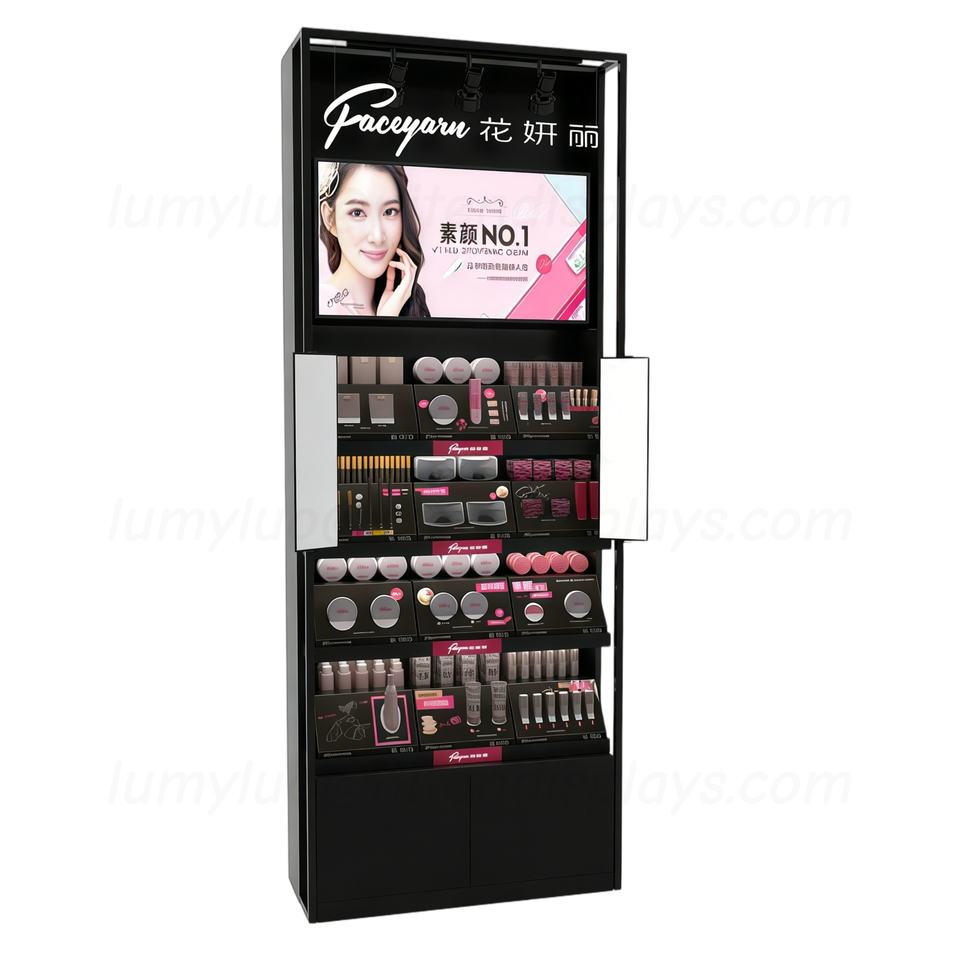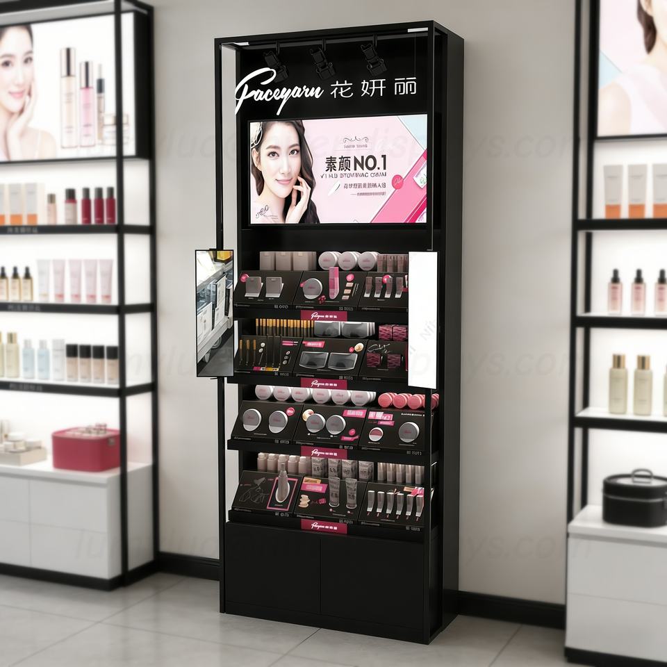 แท่นโชว์เครื่องสำอางแบบมืออาชีพ พร้อมกระจก ไฟสปอตไลท์ปรับได้ และไฟ LED เติมแสง + ตู้เก็บของไม้สำหรับเครื่องสำอาง