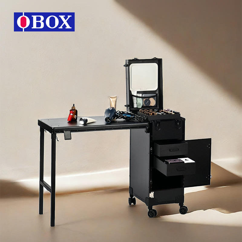 รถเข็นเก็บอุปกรณ์แต่งหน้าแบบมืออาชีพ พร้อมกระจกและลิ้นชัก สำหรับทำเล็บและเครื่องสำอางถาวร สีดำ รูปทรงสี่เหลี่ยมผืนผ้า แบบตั้งพื้น
