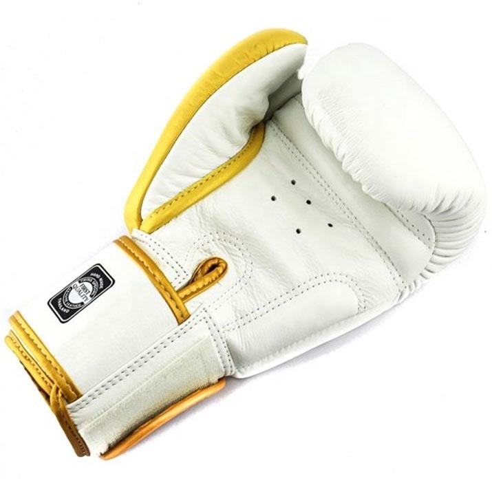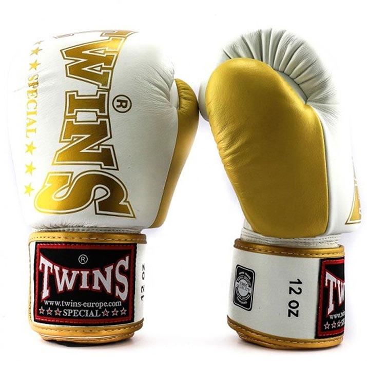 ถุงมือชกมวยไทยมืออาชีพ รุ่น Twins สีขาวทอง สำหรับฝึกซ้อมและแข่งขัน ผลิตตามแบบ OEM ปรับแต่งได้ ยี่ห้อ Fairtex แบบรัดข้อเท้า สำหรับกีฬาศิลปะการต่อสู้
