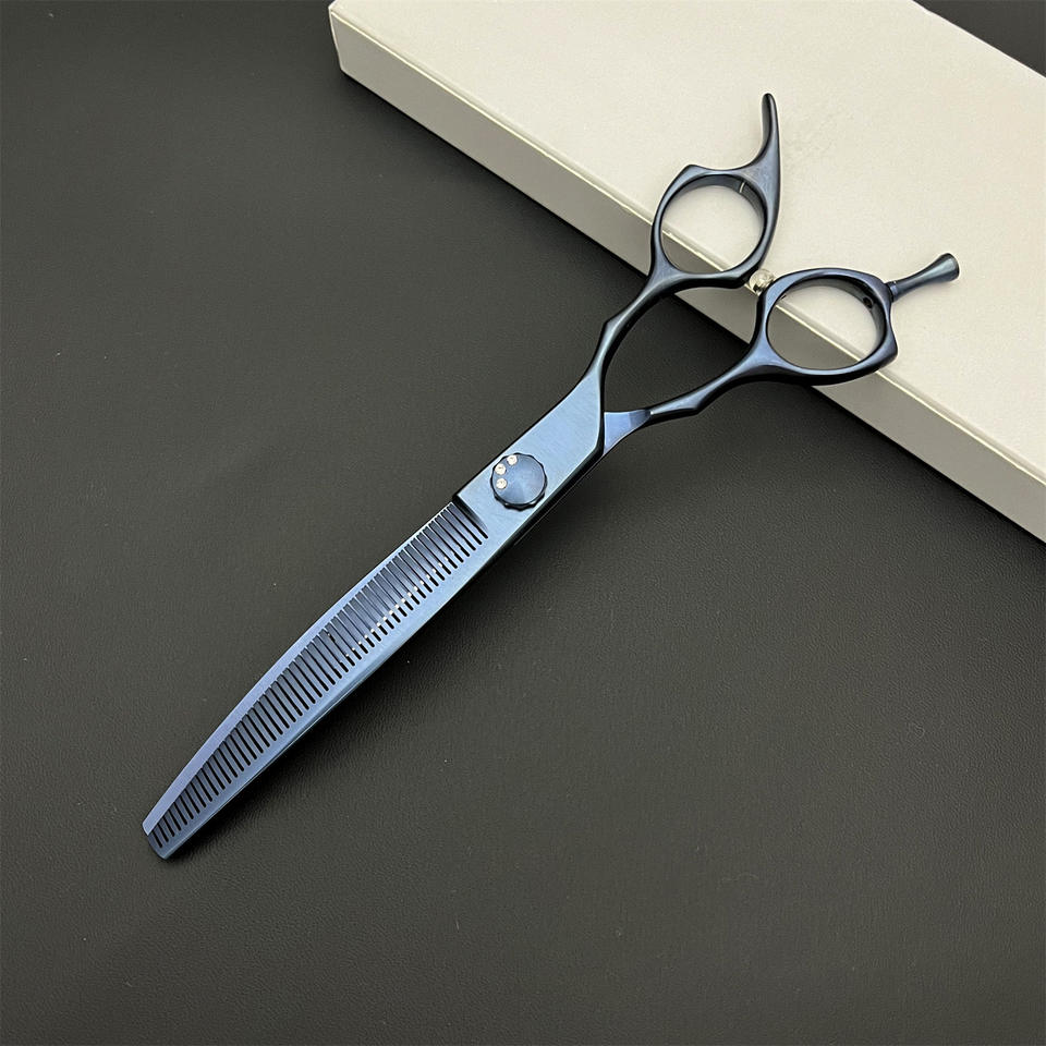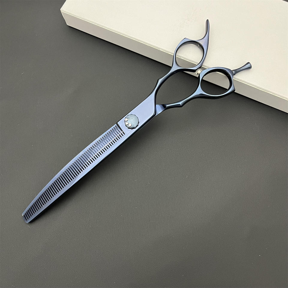 กรรไกรตัดขนสัตว์มืออาชีพ ขนาด 7.5 นิ้ว ใบมีดโค้งทำจากเหล็กกล้าไร้สนิม 440C ด้ามจับสีน้ำเงินโคบอลต์ สำหรับตัดขนสุนัข