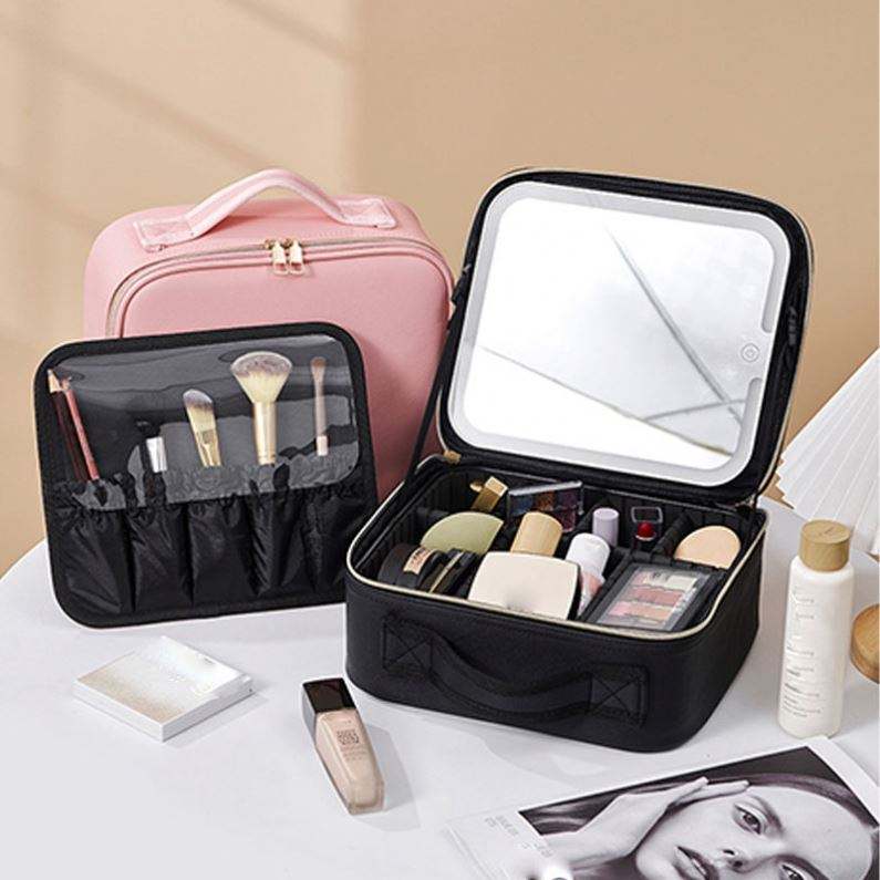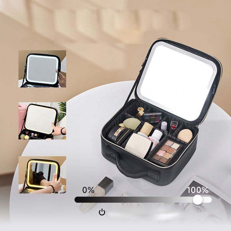 กระเป๋าเครื่องสำอางแบบพกพาขนาดใหญ่ วัสดุ PU พร้อมกระจก LED กล่องเก็บเครื่องสำอางทันสมัย แบบมีซิป