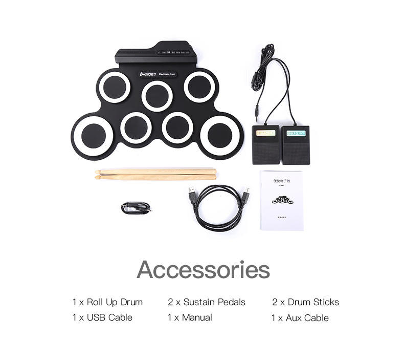 ชุดกลองไฟฟ้าแบบพกพาสำหรับมืออาชีพ ยี่ห้อ OEM ดีไซน์พับเก็บได้แบบม้วน พื้นผิวอะลูมิเนียมและเหล็ก สีดำ ปรับแต่งได้ สำหรับดนตรีแจ๊ส