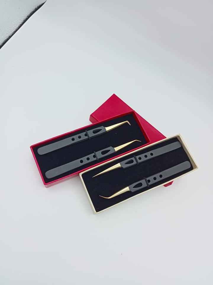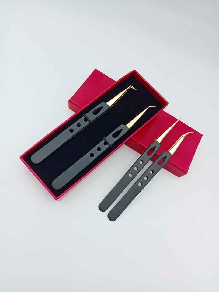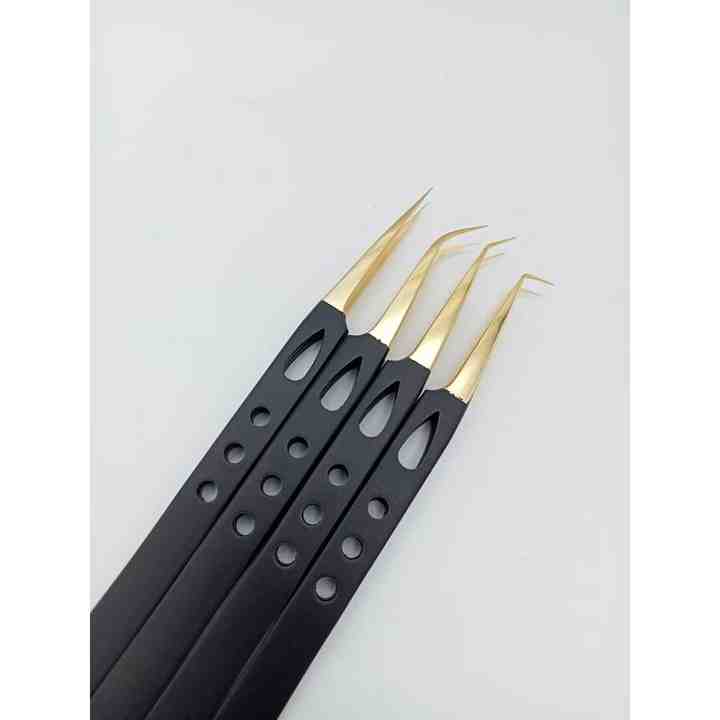 แหนบต่อขนตาสแตนเลสสีดำ ด้ามจับลายดีไซน์เก๋ พร้อมปลายสีทองอย่างแม่นยำ สำหรับมืออาชีพ