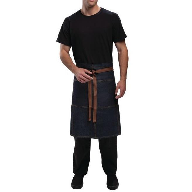 ผ้ากันเปื้อนผ้ายีนส์แขนกุดแบบมืออาชีพปรับโลโก้ได้สีดำสีฟ้าสีเขียวพร้อมสายรัดสีน้ำตาล